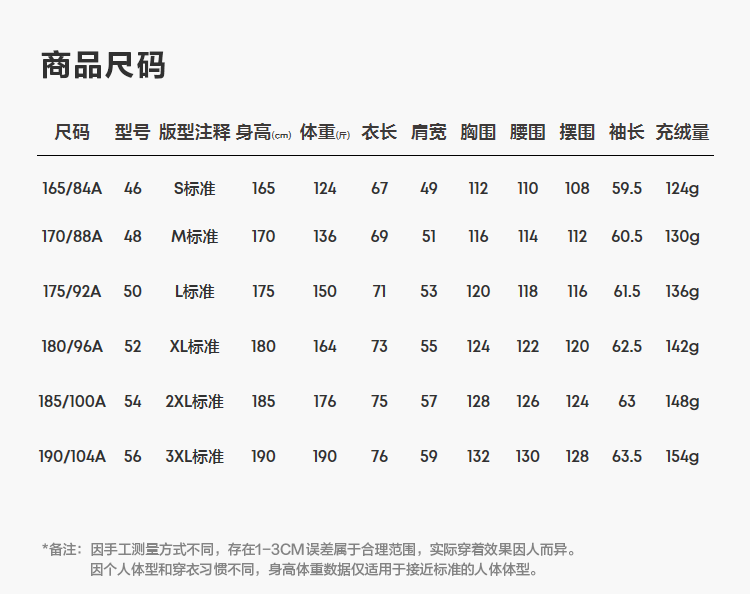 China (cm) 165 / 88-90 170 / 96-98 175 / 108-110 180 / 118-122 185 / 126-130