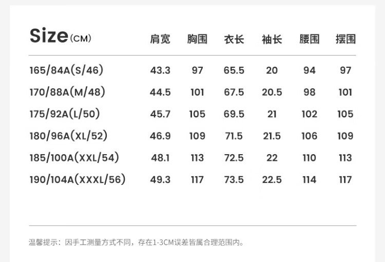 China (cm) 165 / 88-90 170 / 96-98 175 / 108-110 180 / 118-122 185 / 126-130