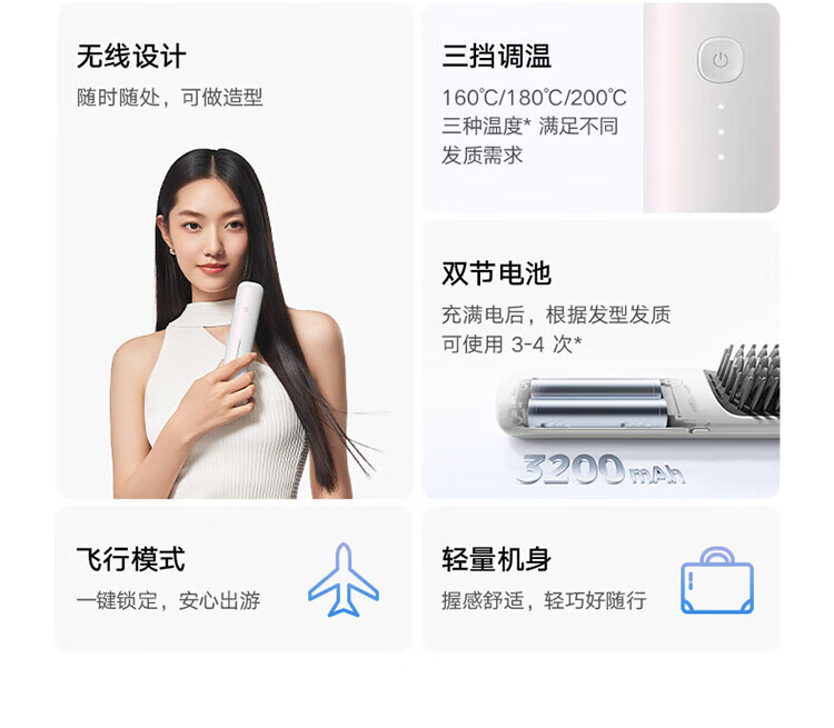 Mijia Wireless Hair Straightening Comb Xiaomi Mini Portable Hair Styling Comb Negative Ion Hair Care Straightening Stick Smoothes Frizz Straightening Comb A Must-Have Colorful White Gift for Girlfriends on her Birthday