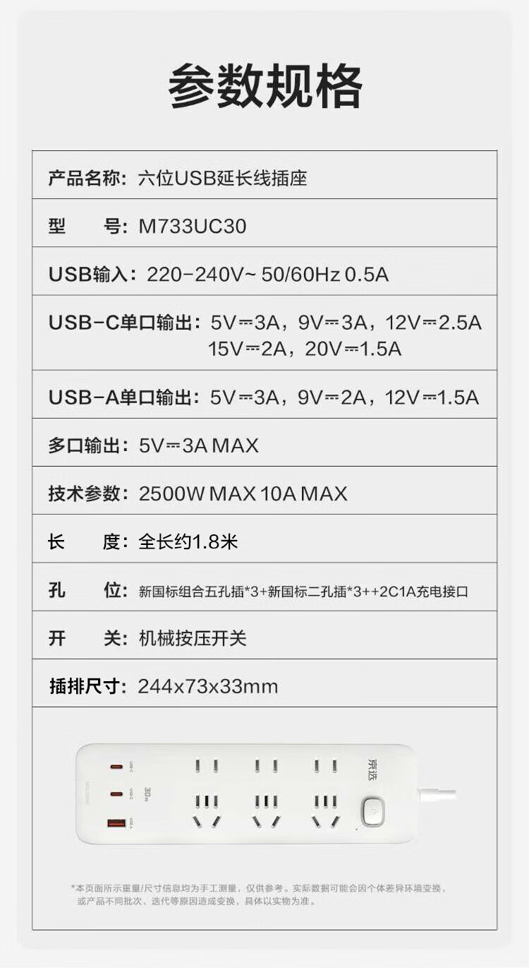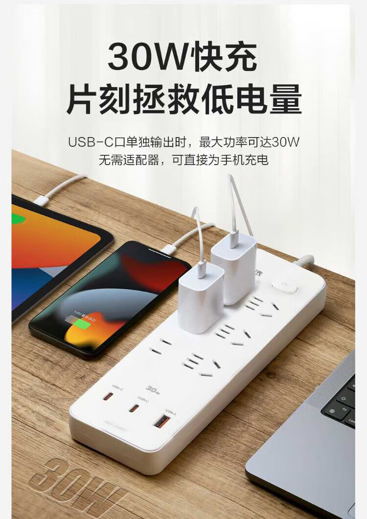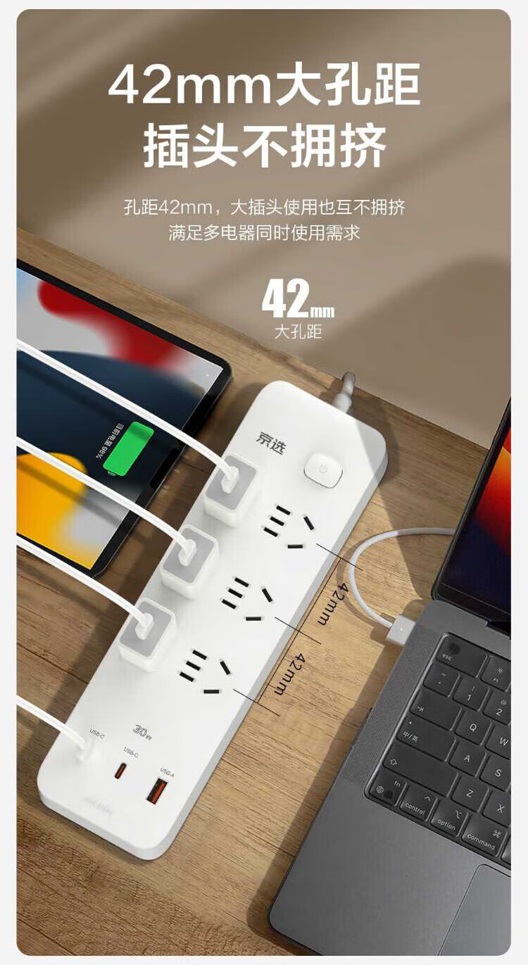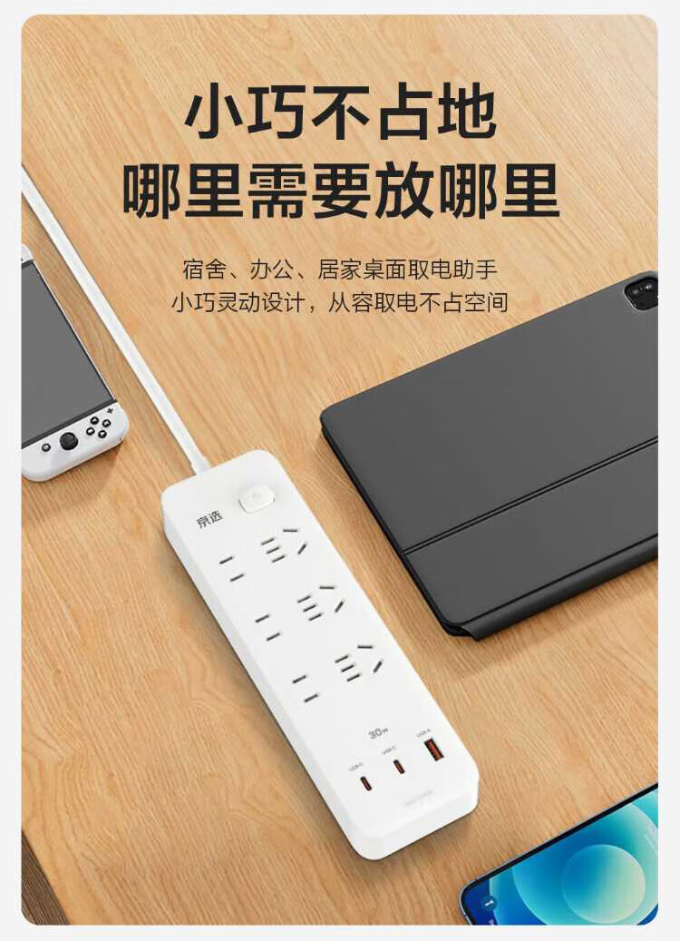 Jingxuan Jingdong's own brand 30WPD fast charging socket/socket board/socket strip/socket board Type-c port + USB port + 6 jacks full length 1.8 meters white M733UC30