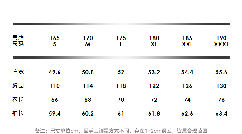 China (cm) 165 / 88-90 170 / 96-98 175 / 108-110 180 / 118-122 185 / 126-130