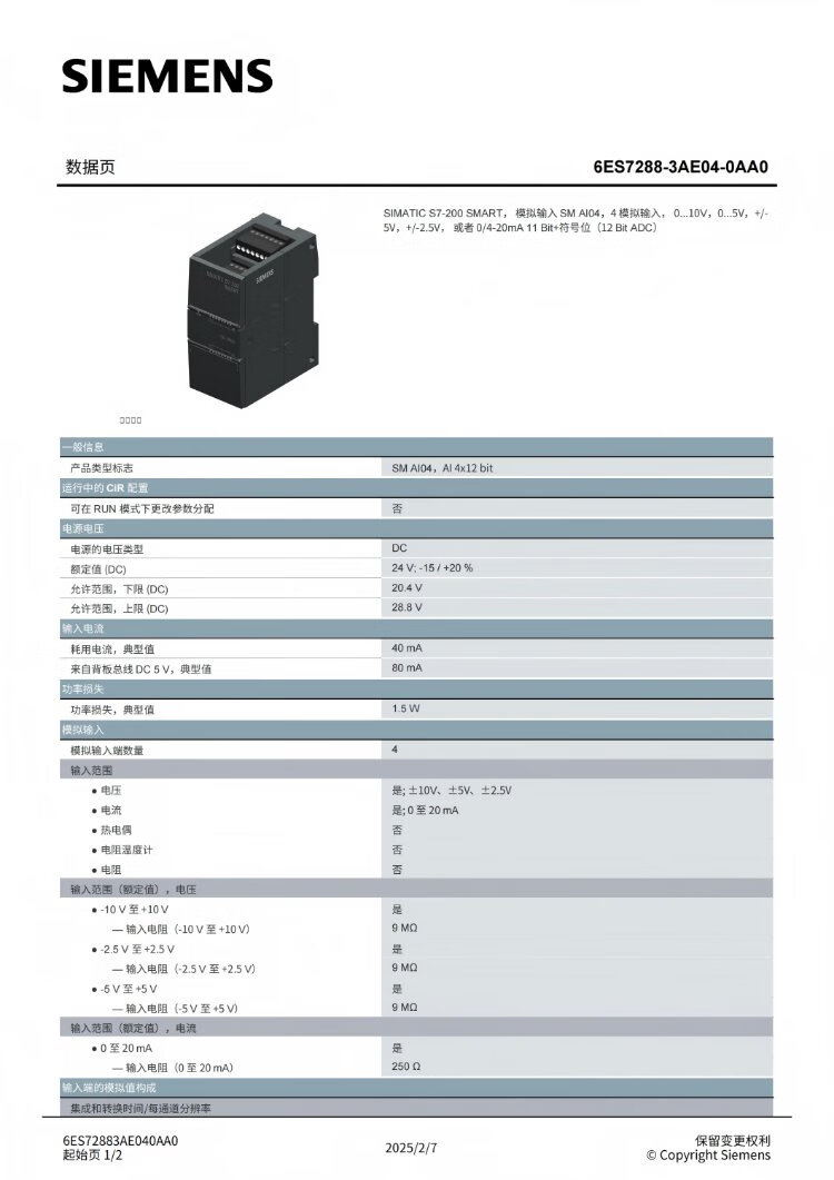Siemens 6ES72883AE040AA0 PLC module controller SIMATIC S7-200 SMART, analog input SM AI04,4 analog input