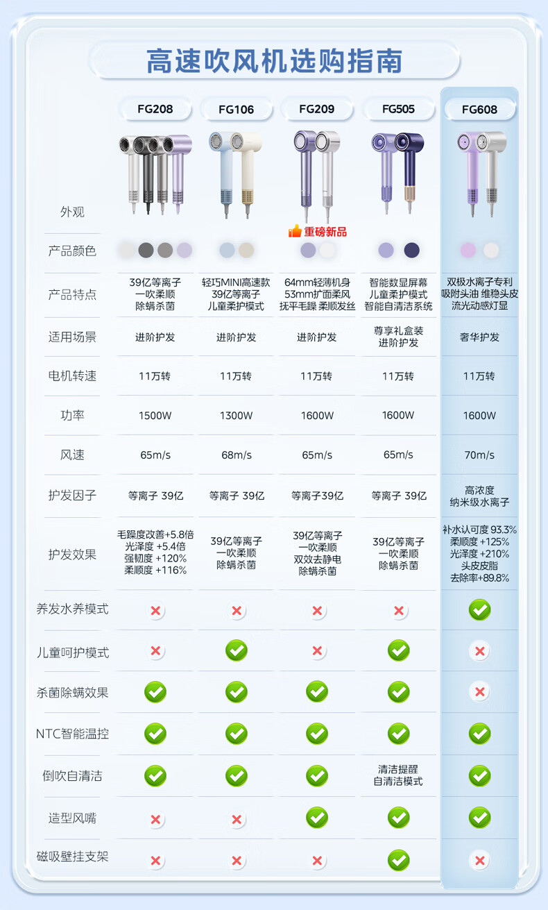 Midea high-speed hair dryer, high-concentration water ion hair care hair dryer, high-power quick-drying household hair dryer FG608 purple, national subsidy, holiday/birthday gift recommendation