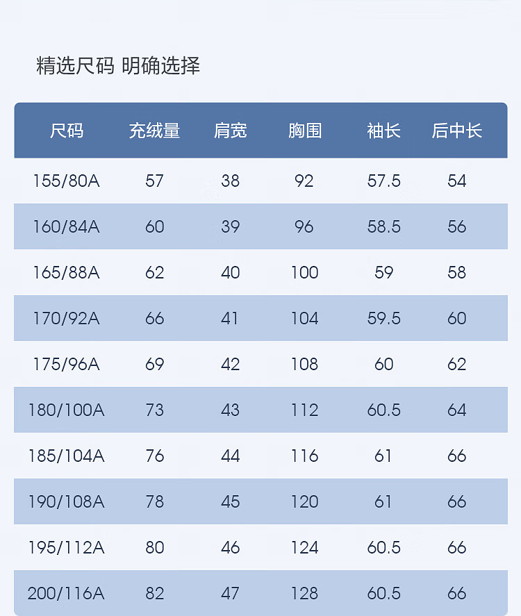 China (cm) 160-165/84-86 165-170 / 88-90 167-172 / 92-96 168-173 / 98-102 170-176 / 106-110