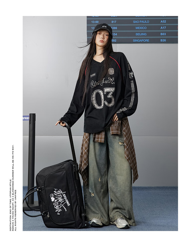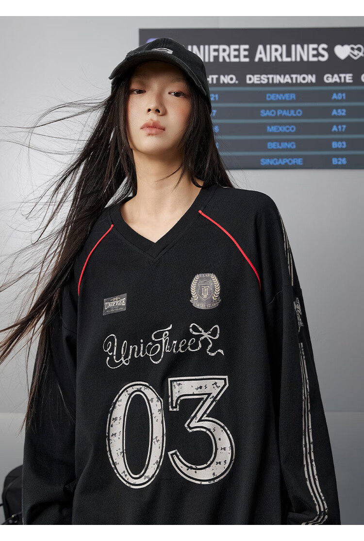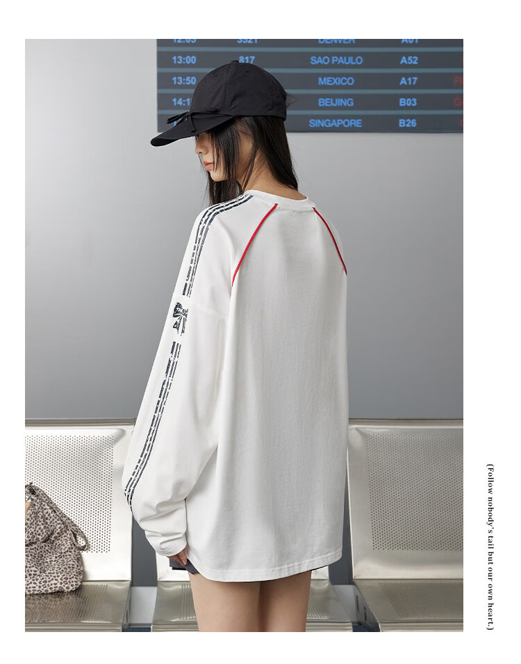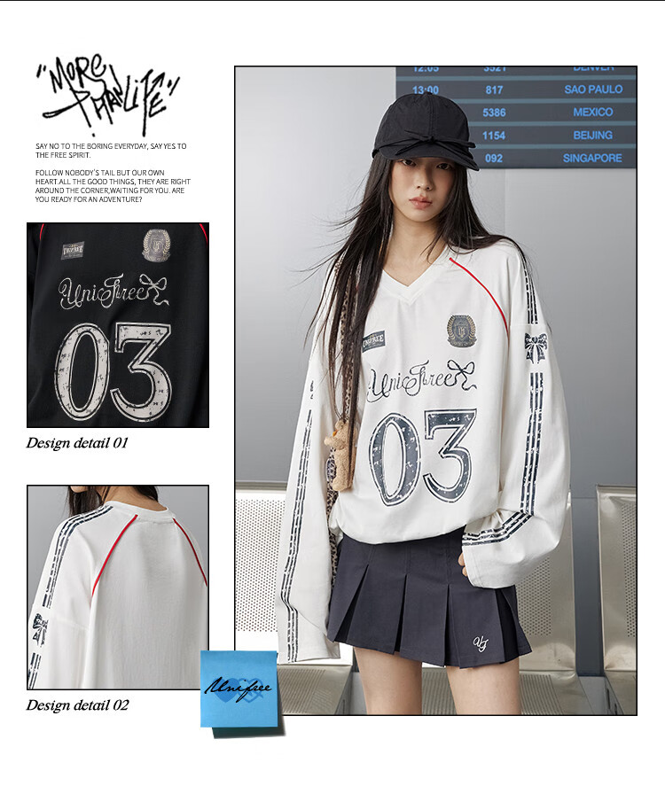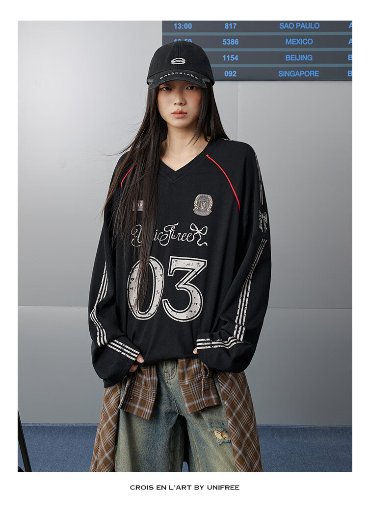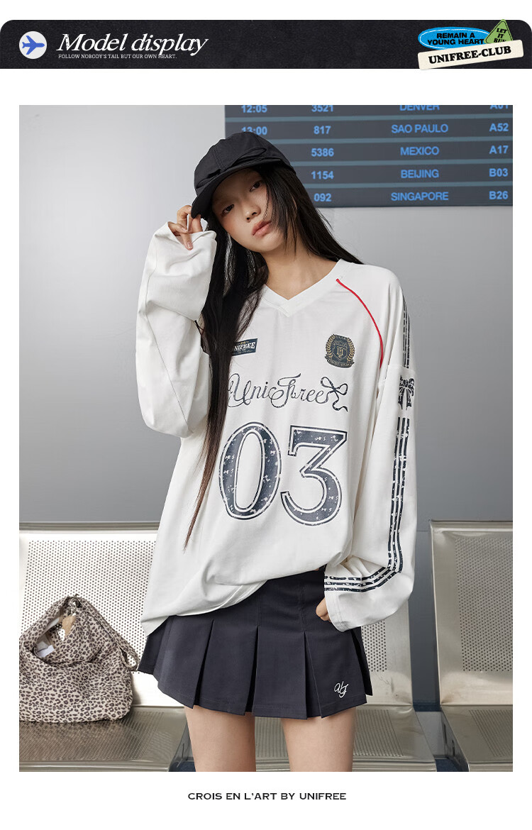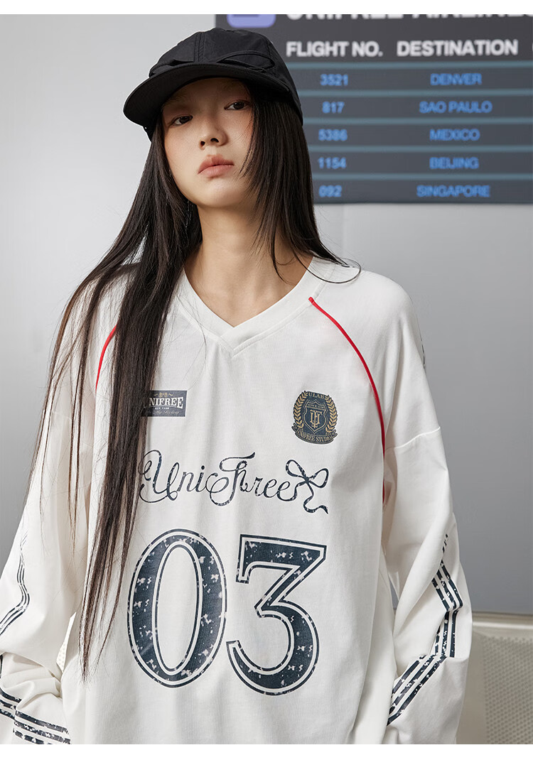 UNIFREE celebrity style American V-neck long-sleeved T-shirt trendy brand sports off-shoulder loose jersey white M