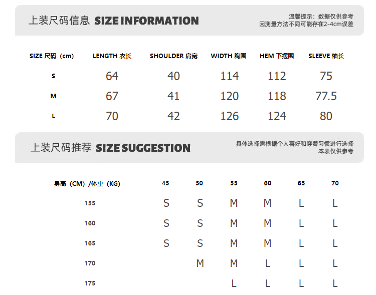 China (cm) 160-165/84-86 165-170 / 88-90 167-172 / 92-96 168-173 / 98-102 170-176 / 106-110