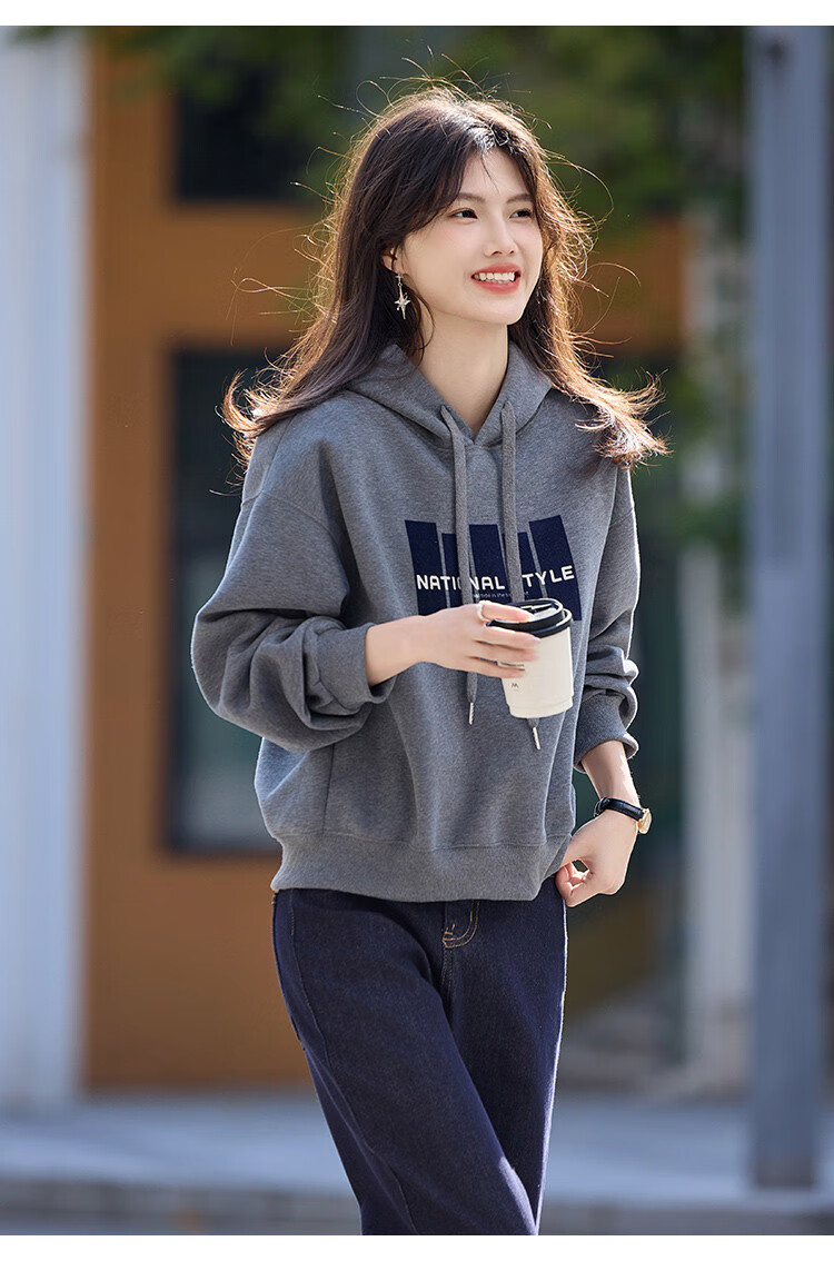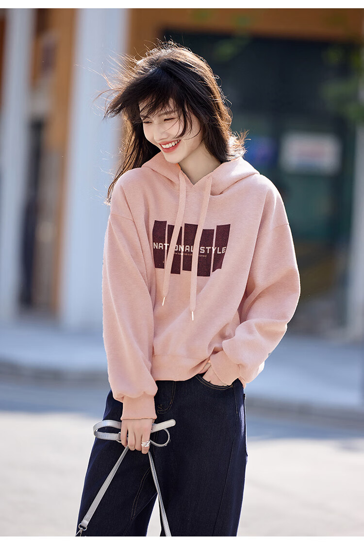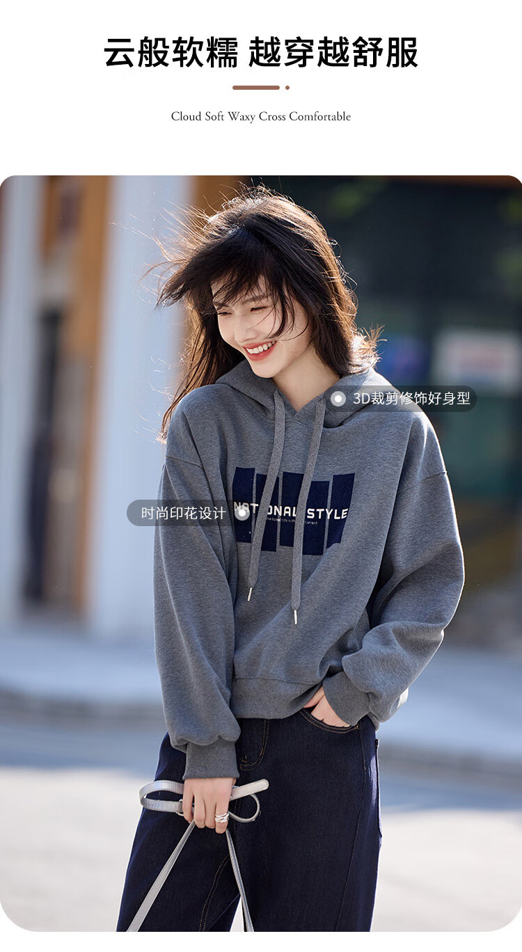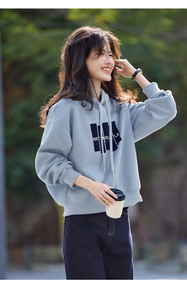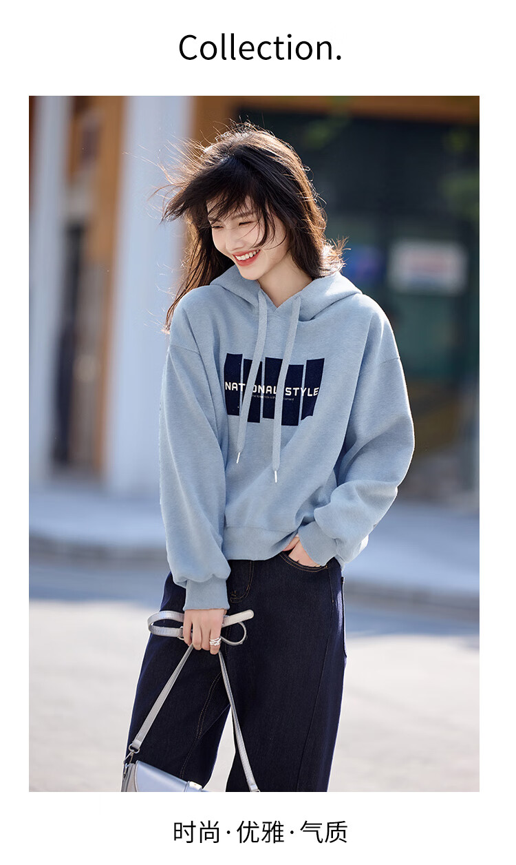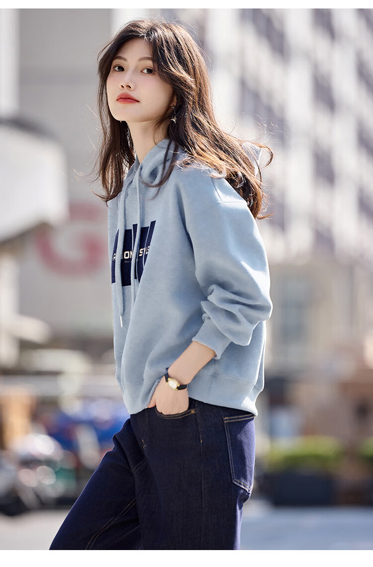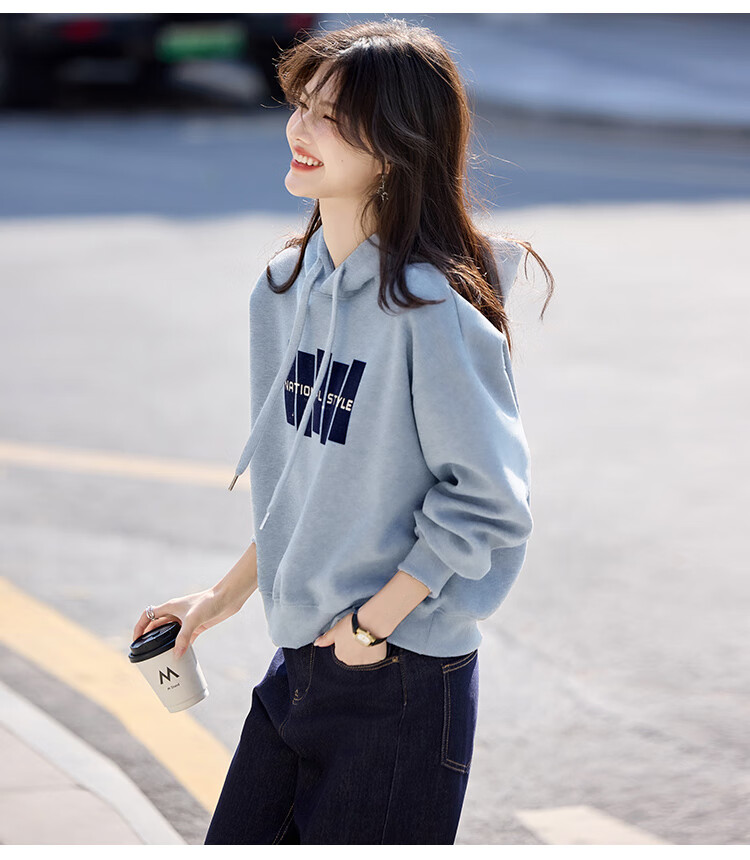 Shangjing Letter Color Block Hooded Sweatshirt Women's 2025 Autumn New Loose Casual Versatile Drawstring Top Blue L