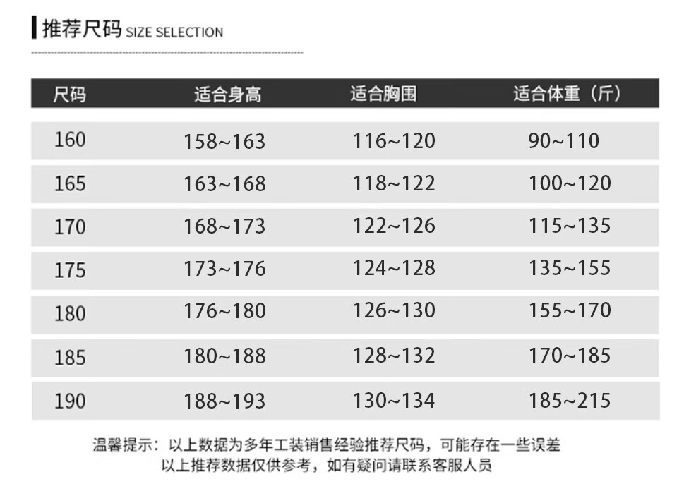 China (cm) 165 / 88-90 170 / 96-98 175 / 108-110 180 / 118-122 185 / 126-130