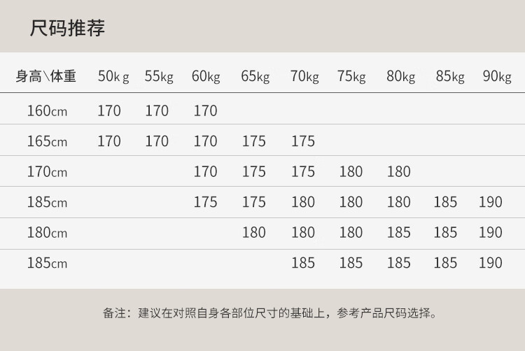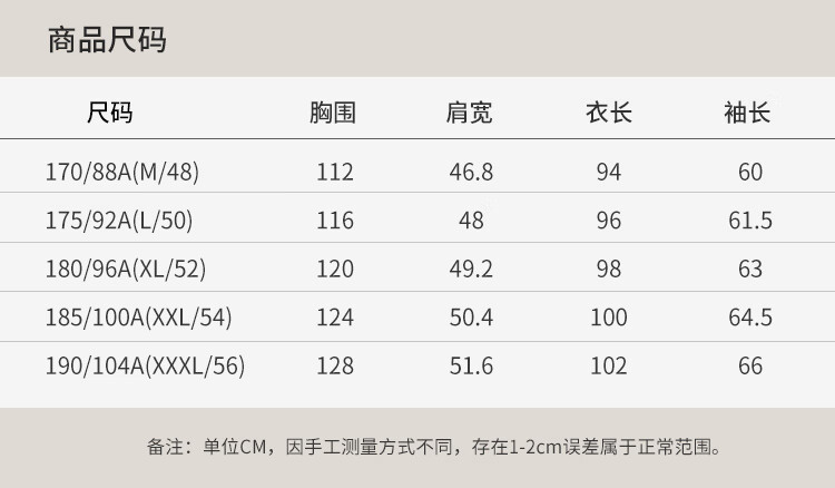 China (cm) 165 / 88-90 170 / 96-98 175 / 108-110 180 / 118-122 185 / 126-130