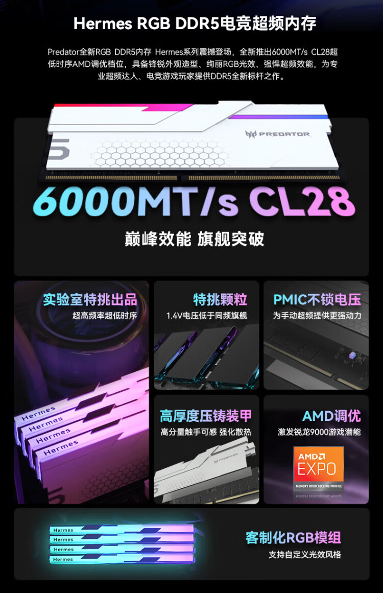Acer PREDATOR 48G (24G 2) set DDR5 6000 frequency desktop memory stick Hermes Ice Blade series RGB light strip (C28) Shi Yaohei AI computer accessories