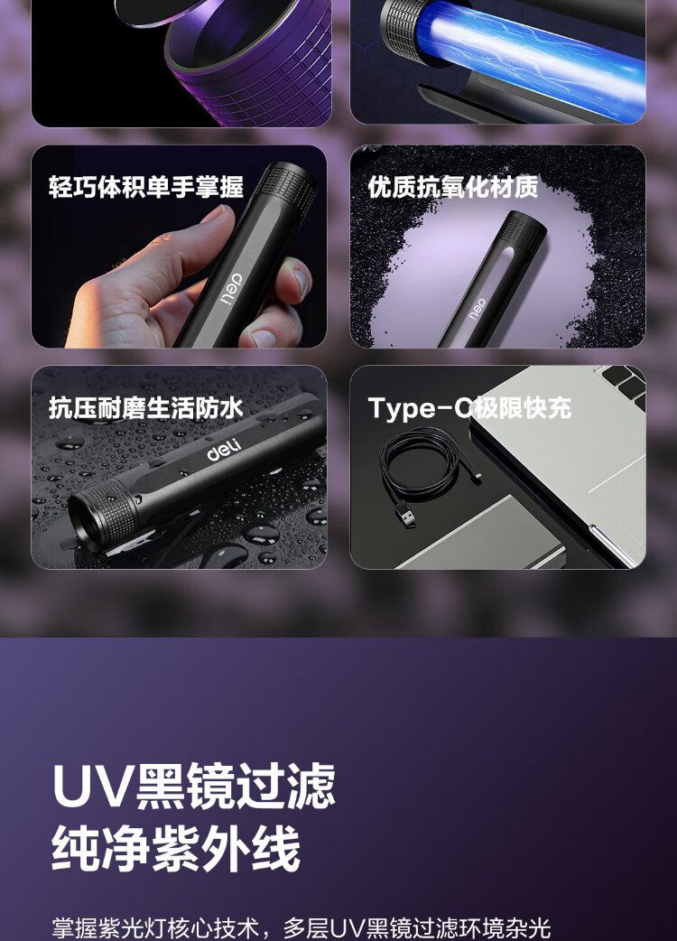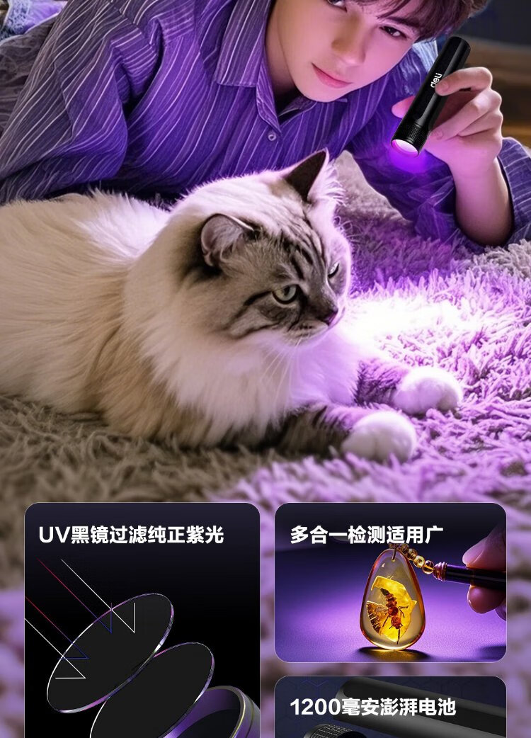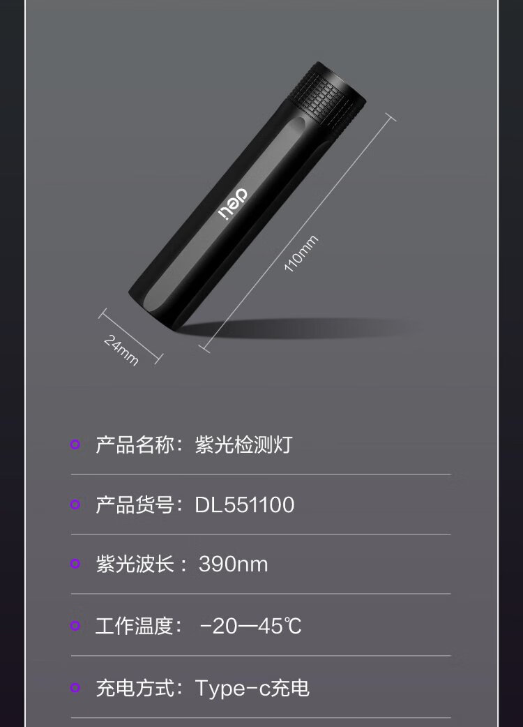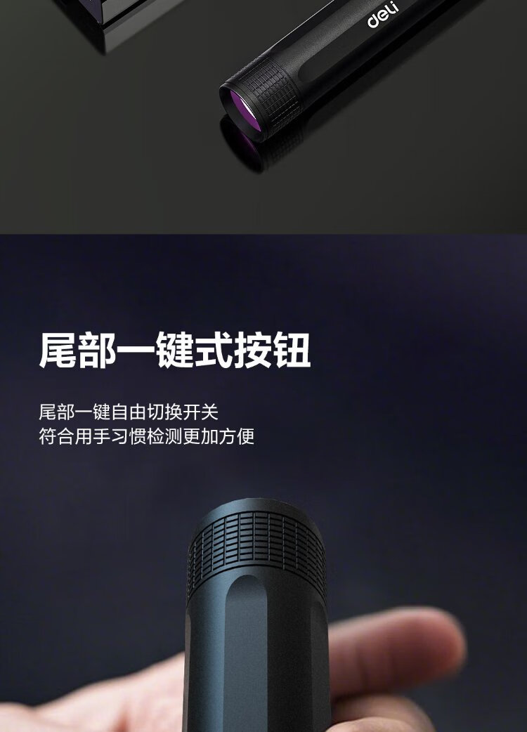 Deli Wood's lamp, purple light, fruit and vegetable identification, cat moss, jade, antiques, 390 tobacco detection, anti-counterfeiting money detection pen, flashlight