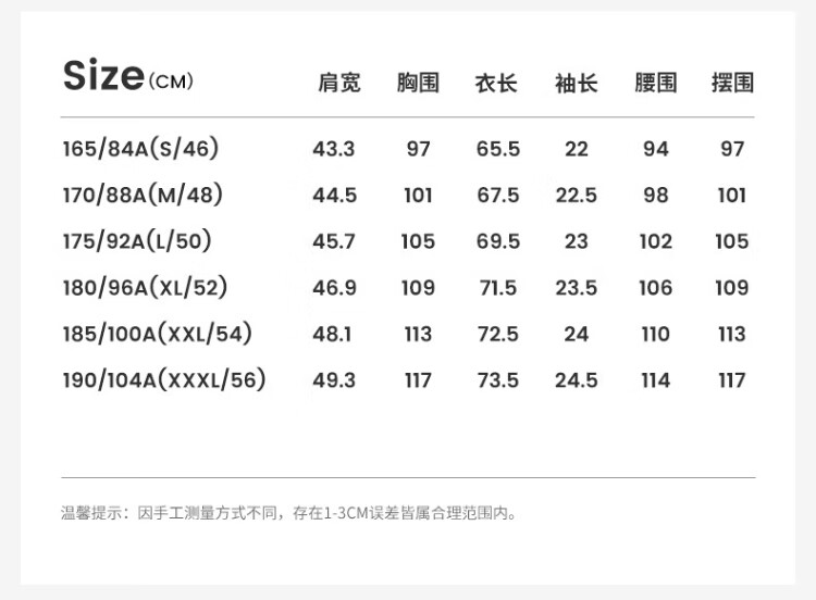 China (cm) 160-165/84-86 165-170 / 88-90 167-172 / 92-96 168-173 / 98-102 170-176 / 106-110