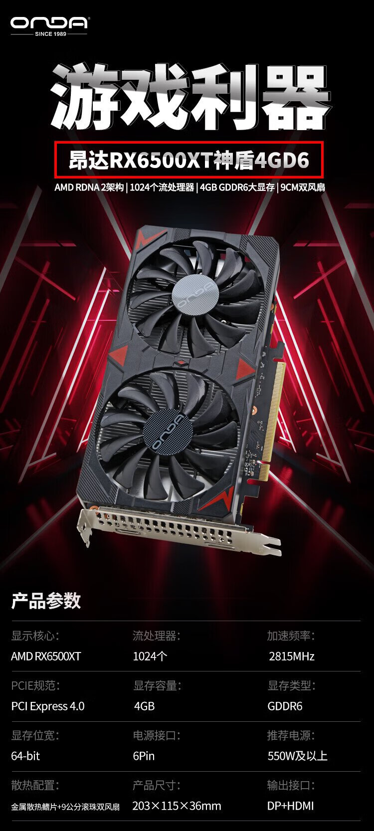 ONDA RX6500XT Aegis 4GD6 4GB GDDR6 eSports gaming graphics card