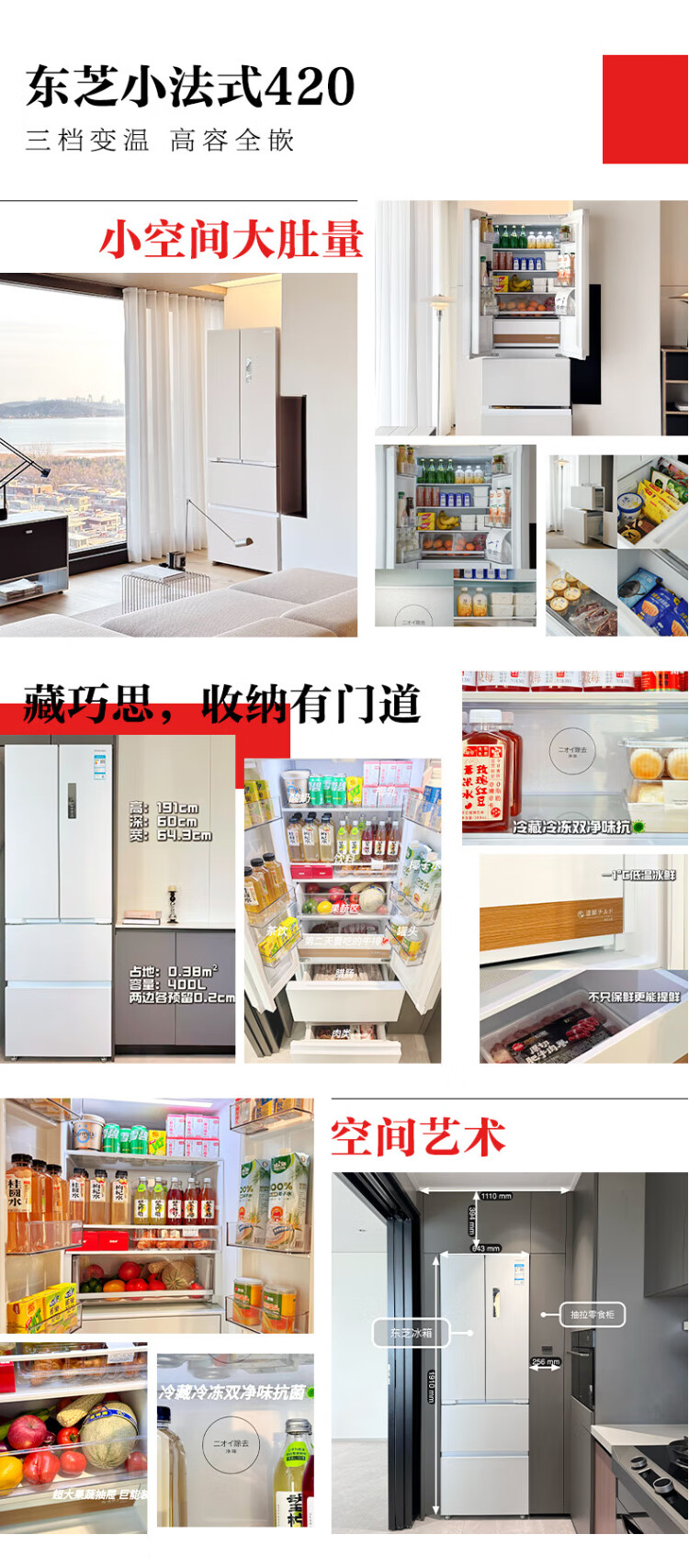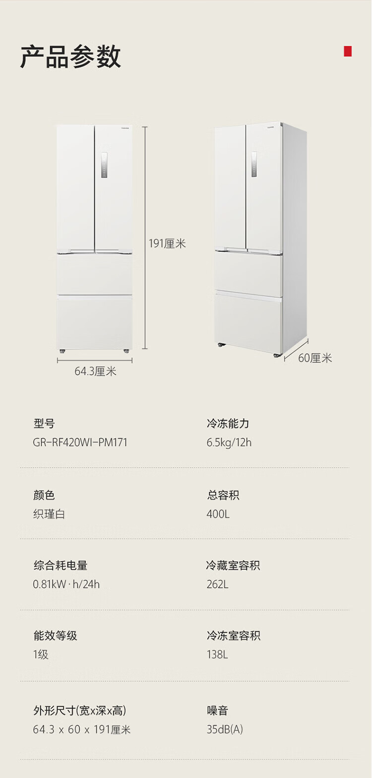 Toshiba (TOSHIBA) small French 420 multi-door small apartment 60cm embedded four-door first-class energy efficiency air-cooled frost-free inverter refrigerator household national subsidy GR-RF420WI-PM171