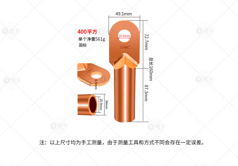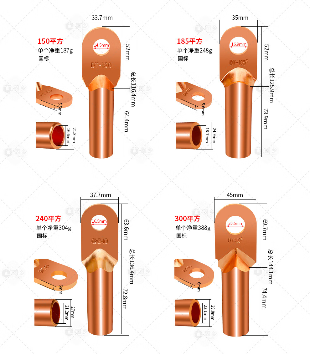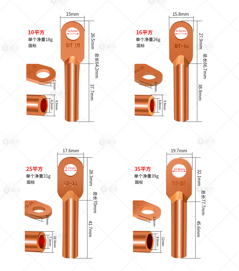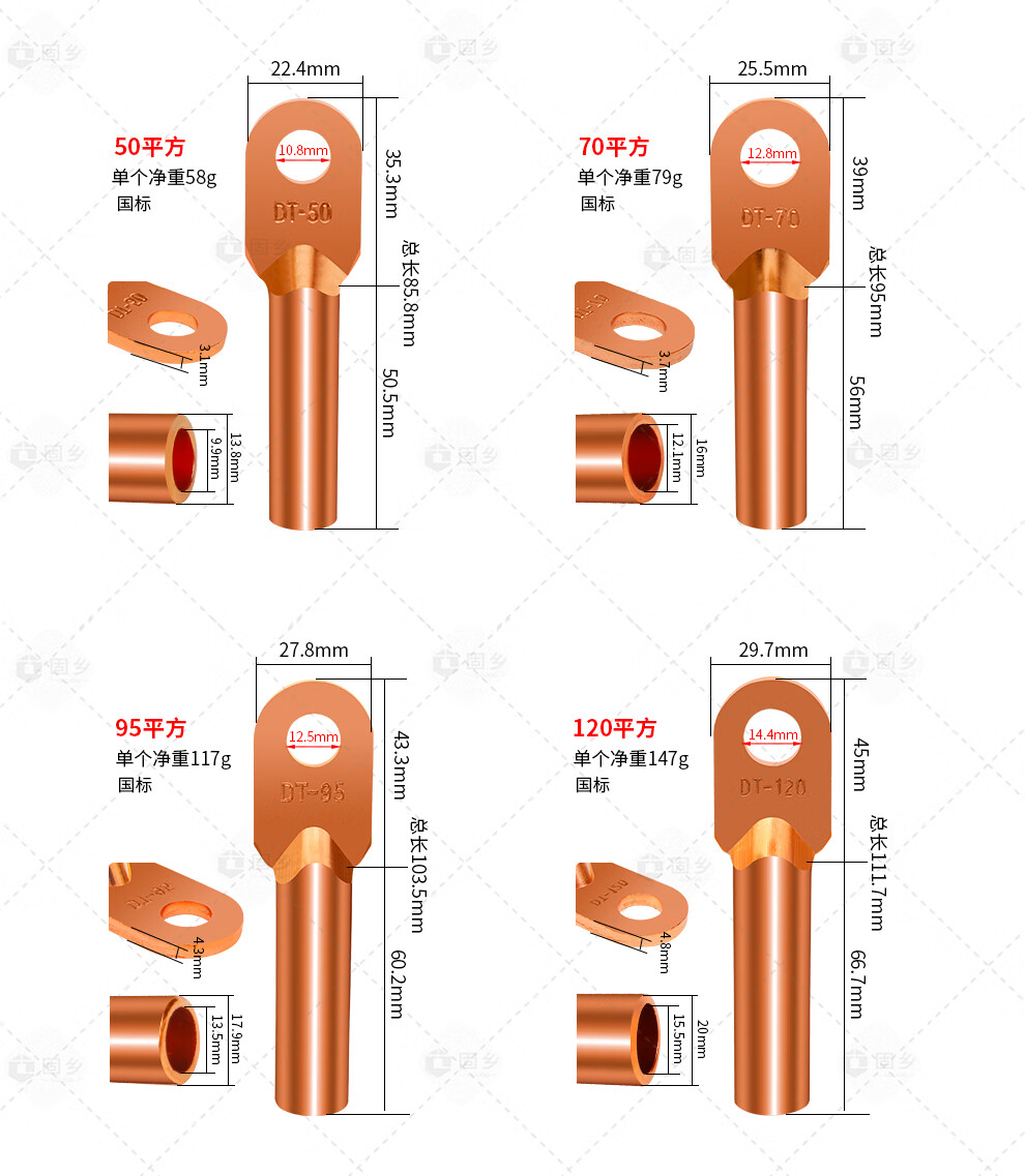 Guxiang DT copper nose wire nose cold-pressed terminal block copper wire ear copper wiring cable lug terminal nose national standard A grade 95 square single hole 2 pack