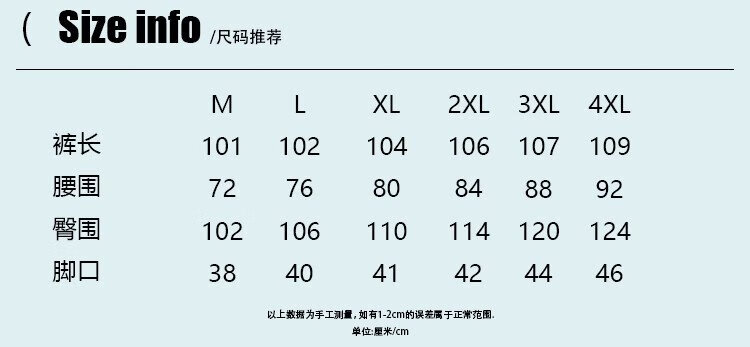Outseam (cm) 99 cm 101.5 cm 104 cm 106.5 cm 109 cm