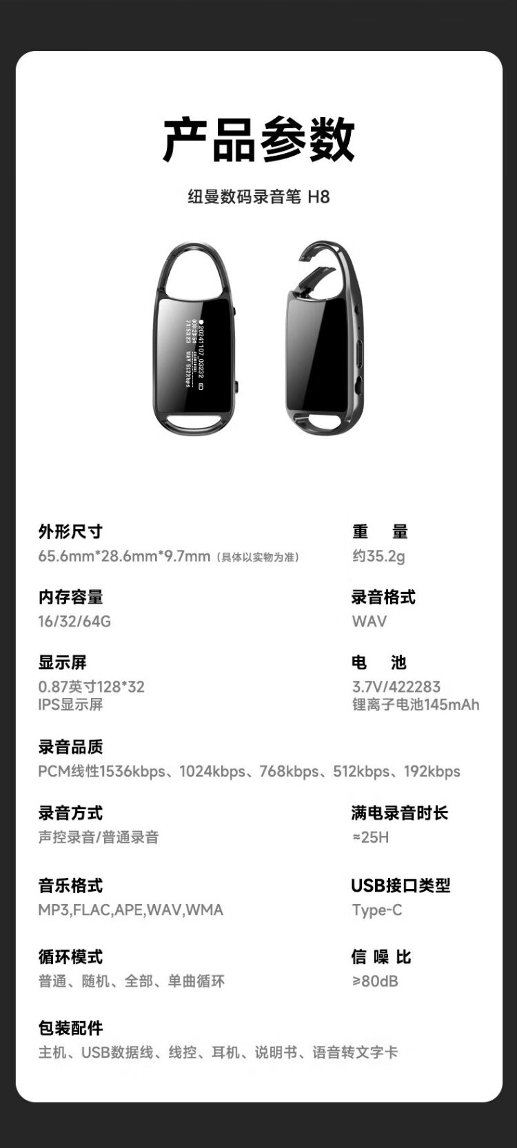Newman lawyer highly recommends 32G noise reduction recording pen, one-click recording smart device, professional lawyer portable high-definition long-distance recording artifact that can be connected to mobile phone H8
