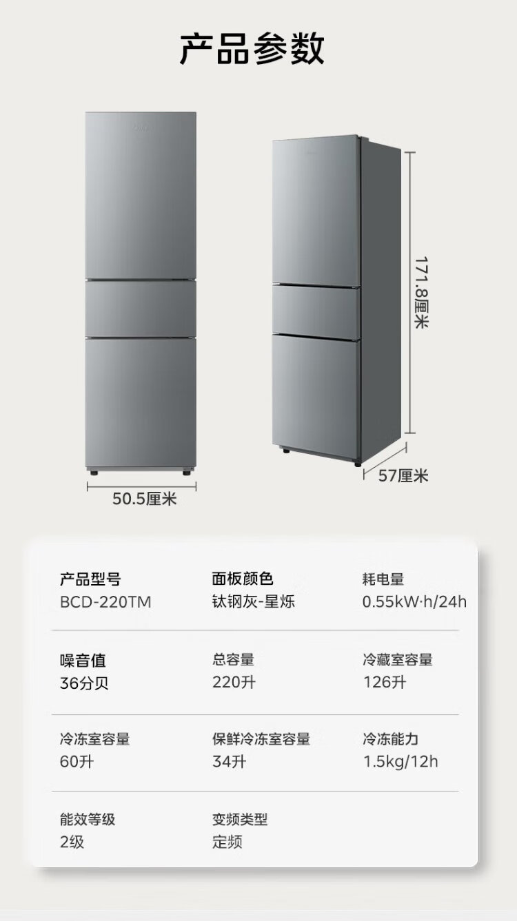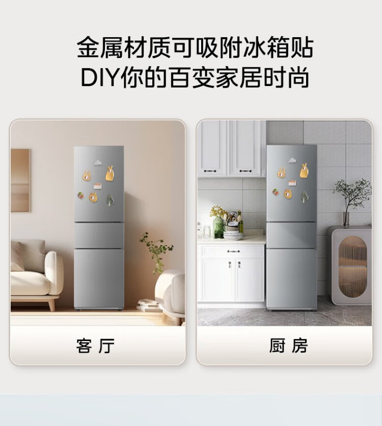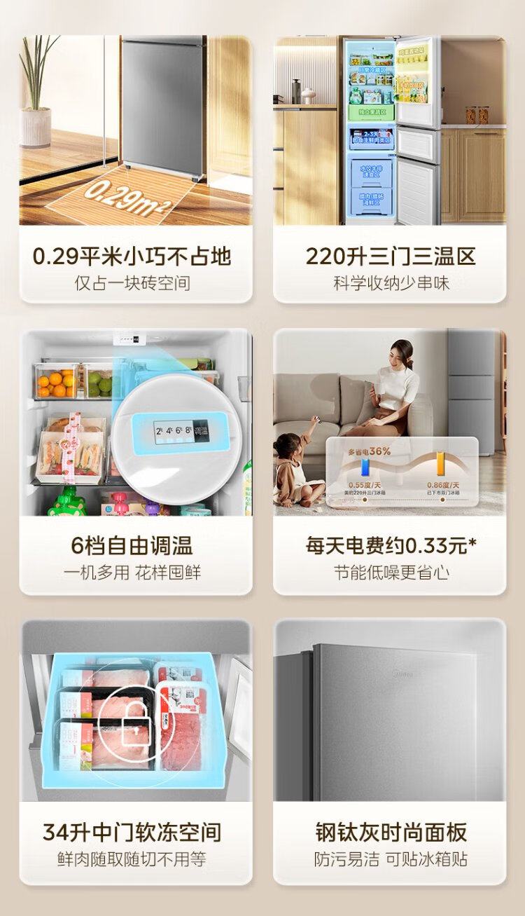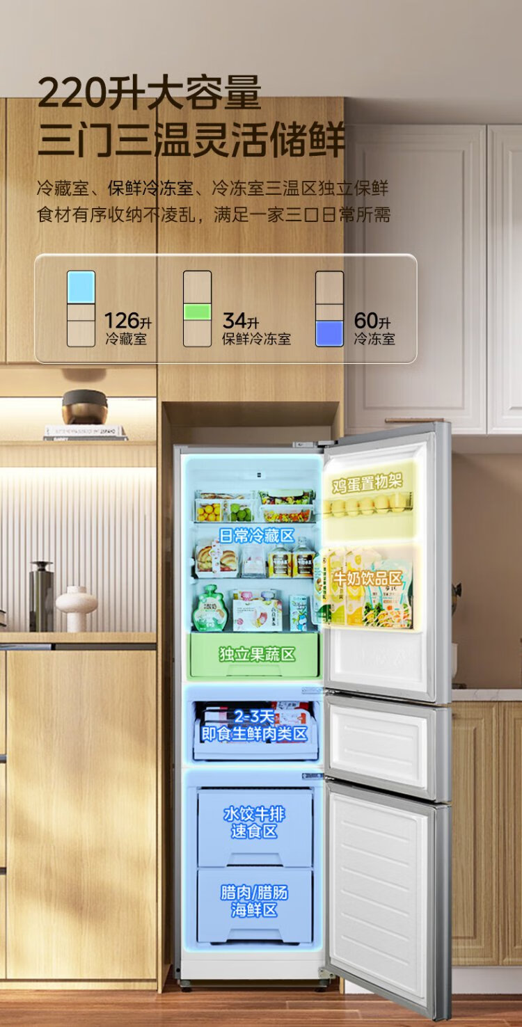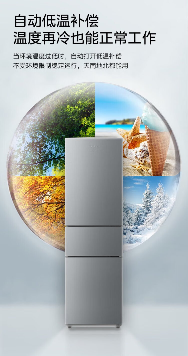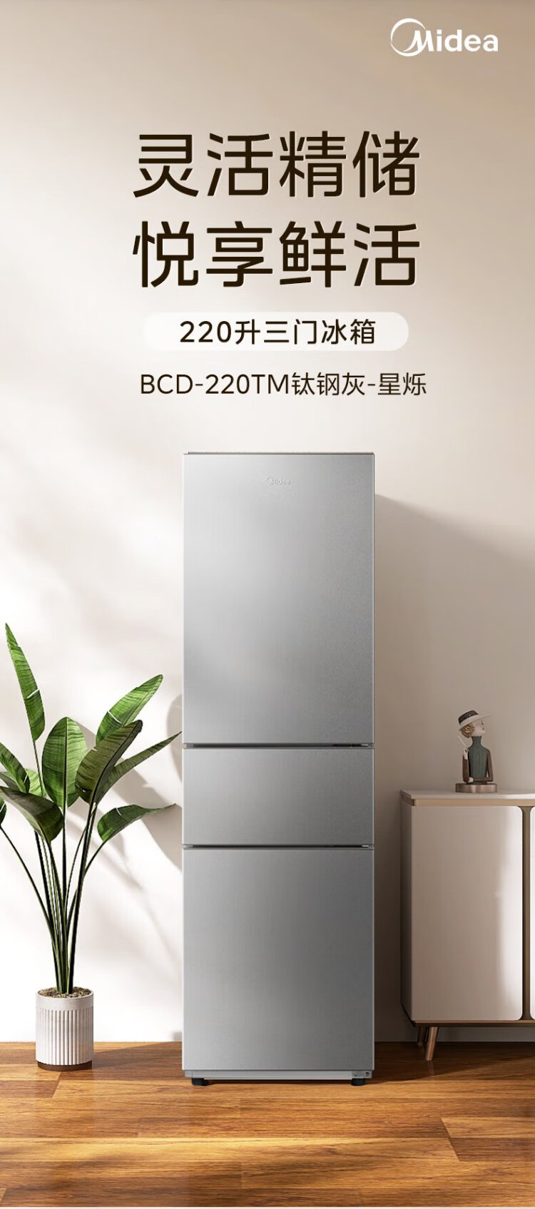 Midea 220-liter three-door three-temperature rental home living room dormitory small refrigerator three-door energy-saving bass operation trade-in BCD-220TM national subsidy