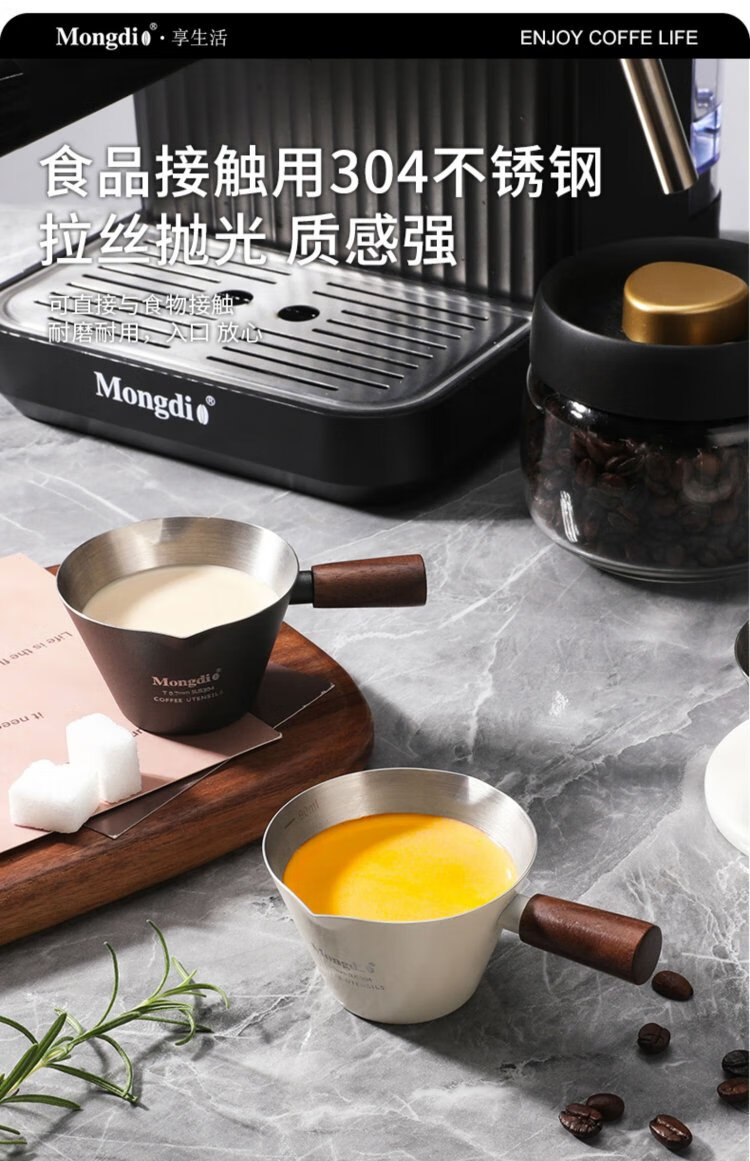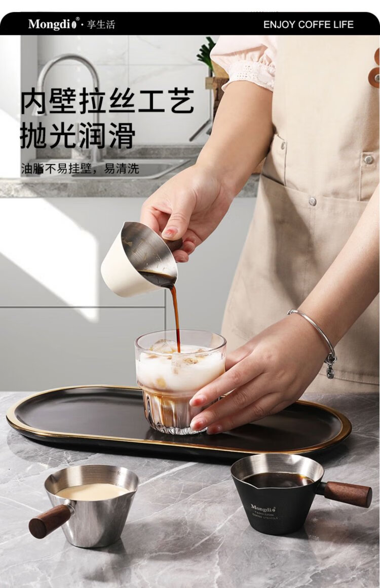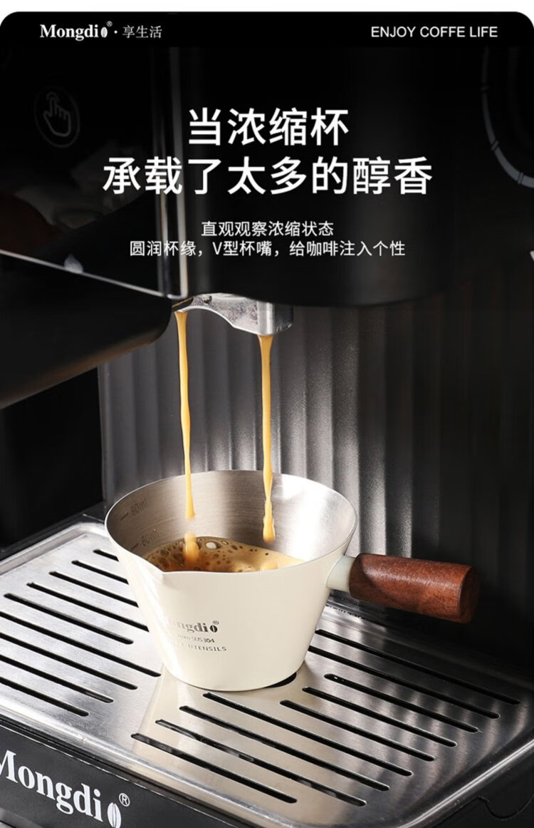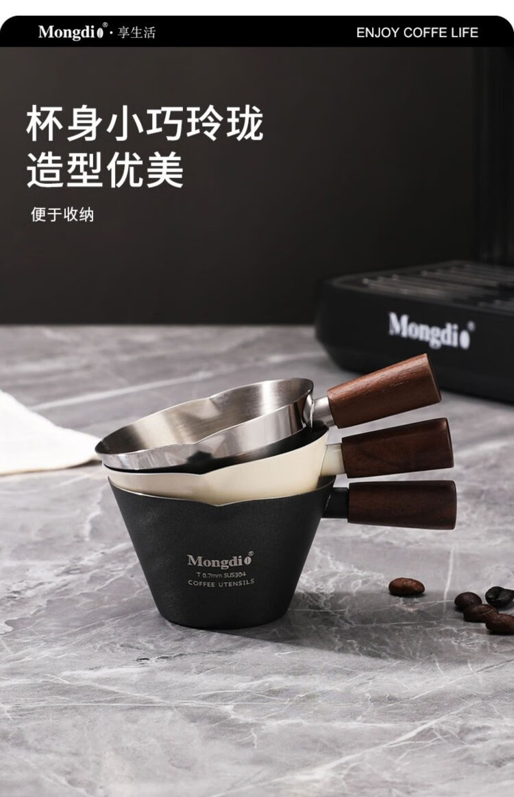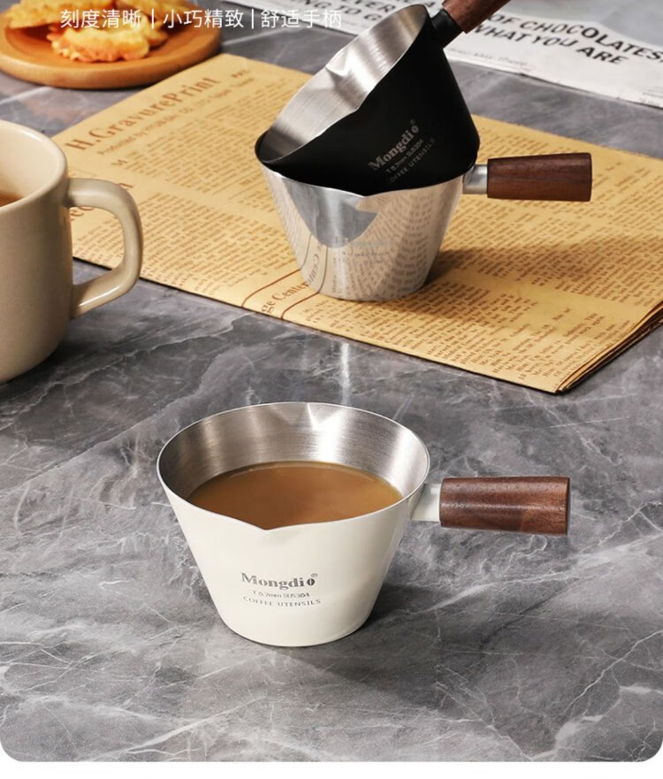 Mongdio coffee extraction cup wooden handle espresso cup coffee liquid cup stainless steel coffee liquid measuring cup with scale