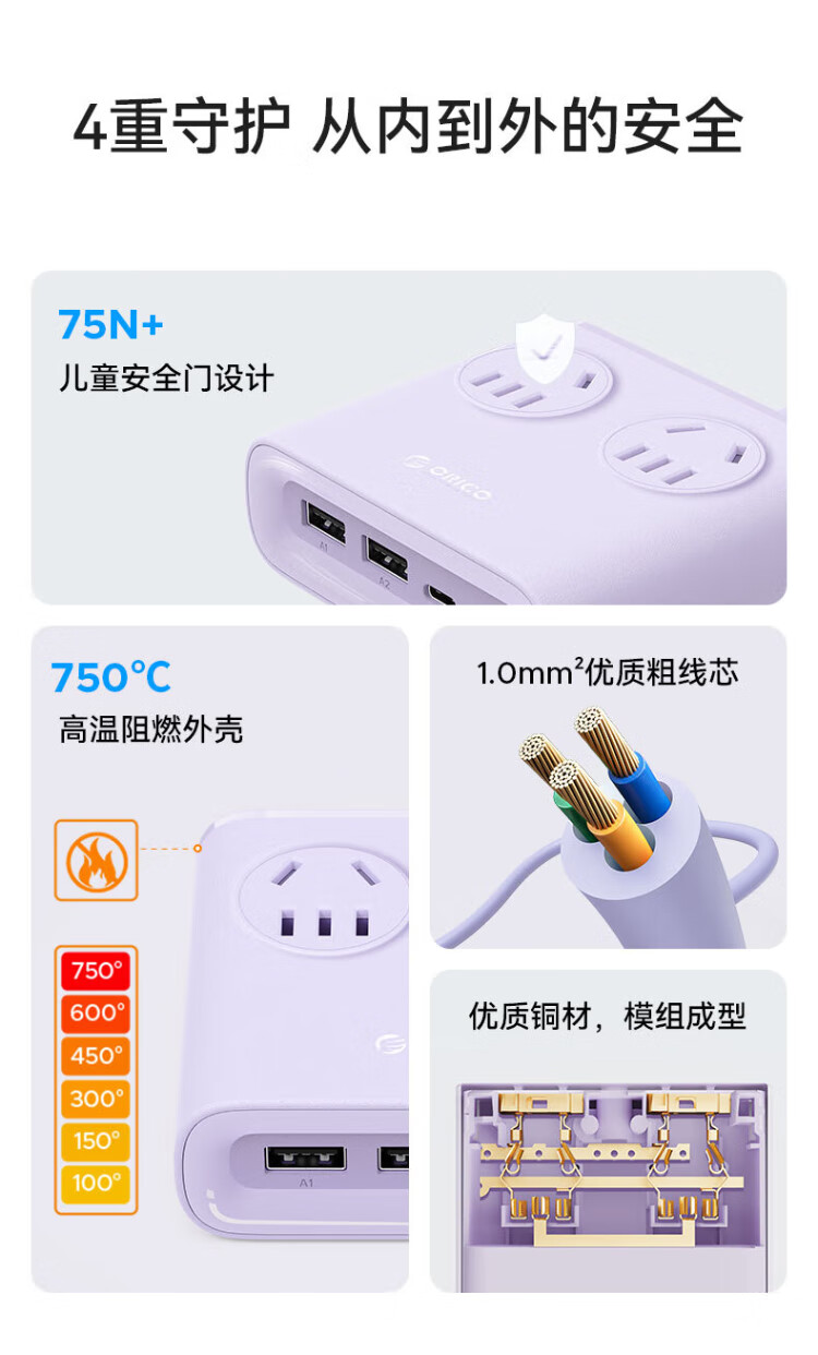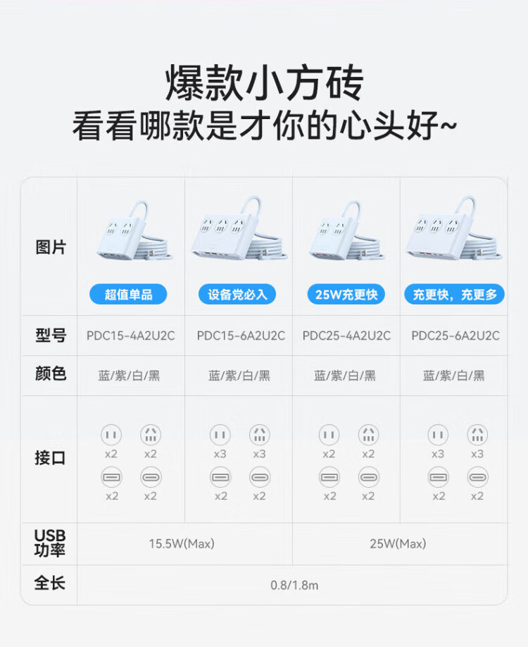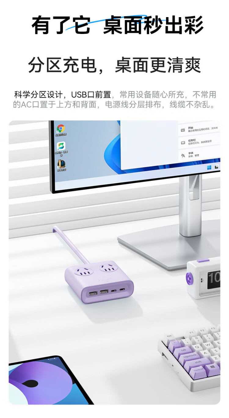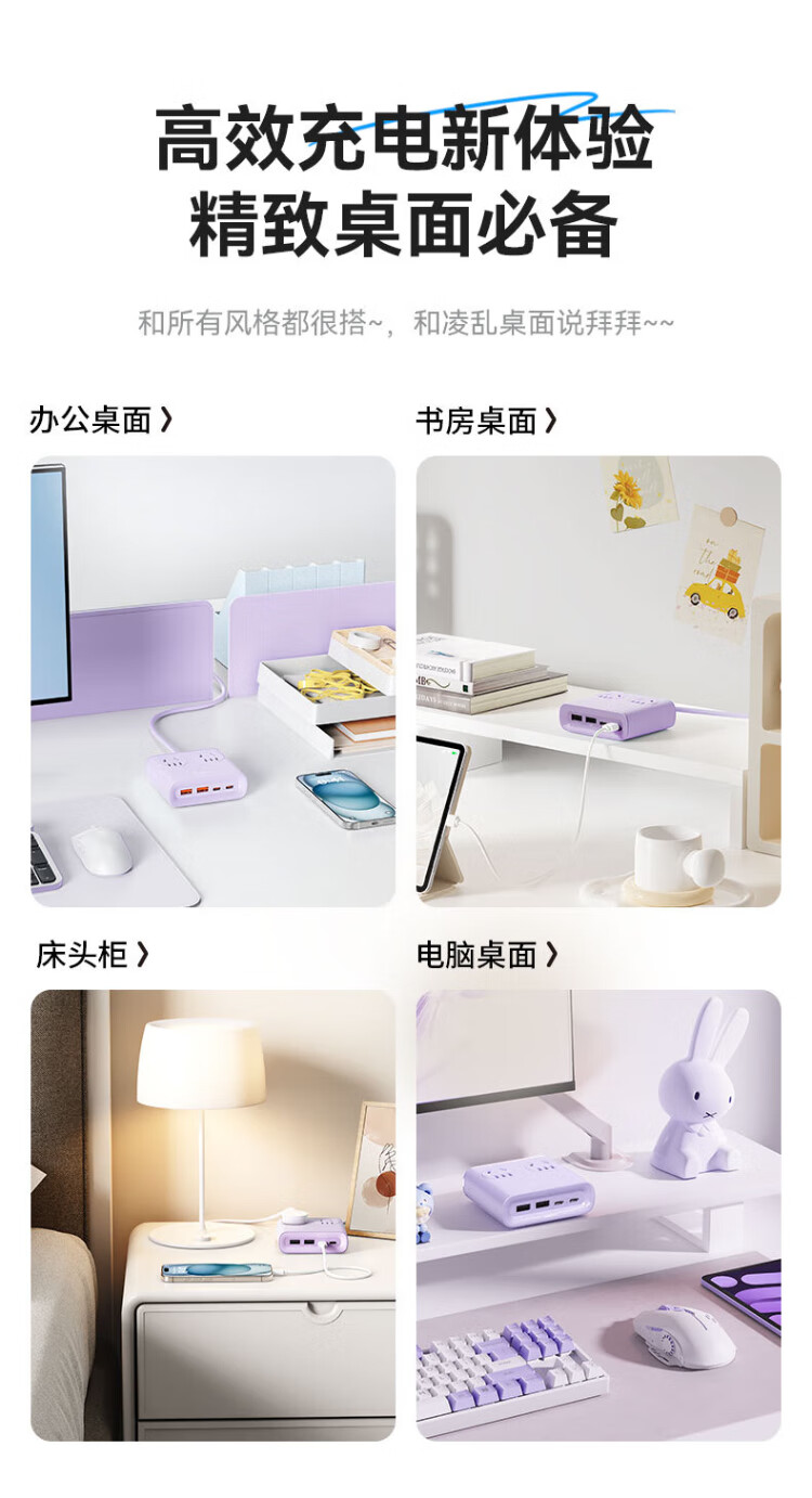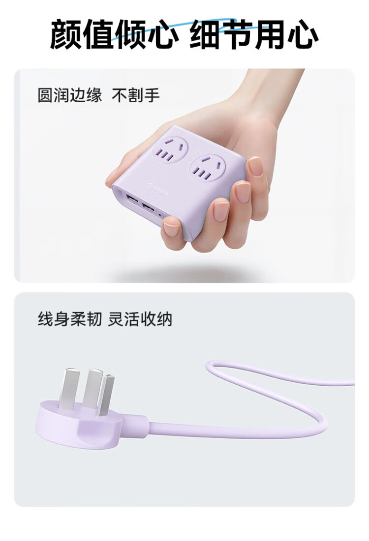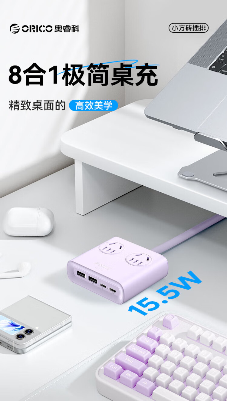 Orrick suitable for iphone17 small square brick desktop charging station plug-in USB socket multi-function plug-in board full length 0.8 meters purple