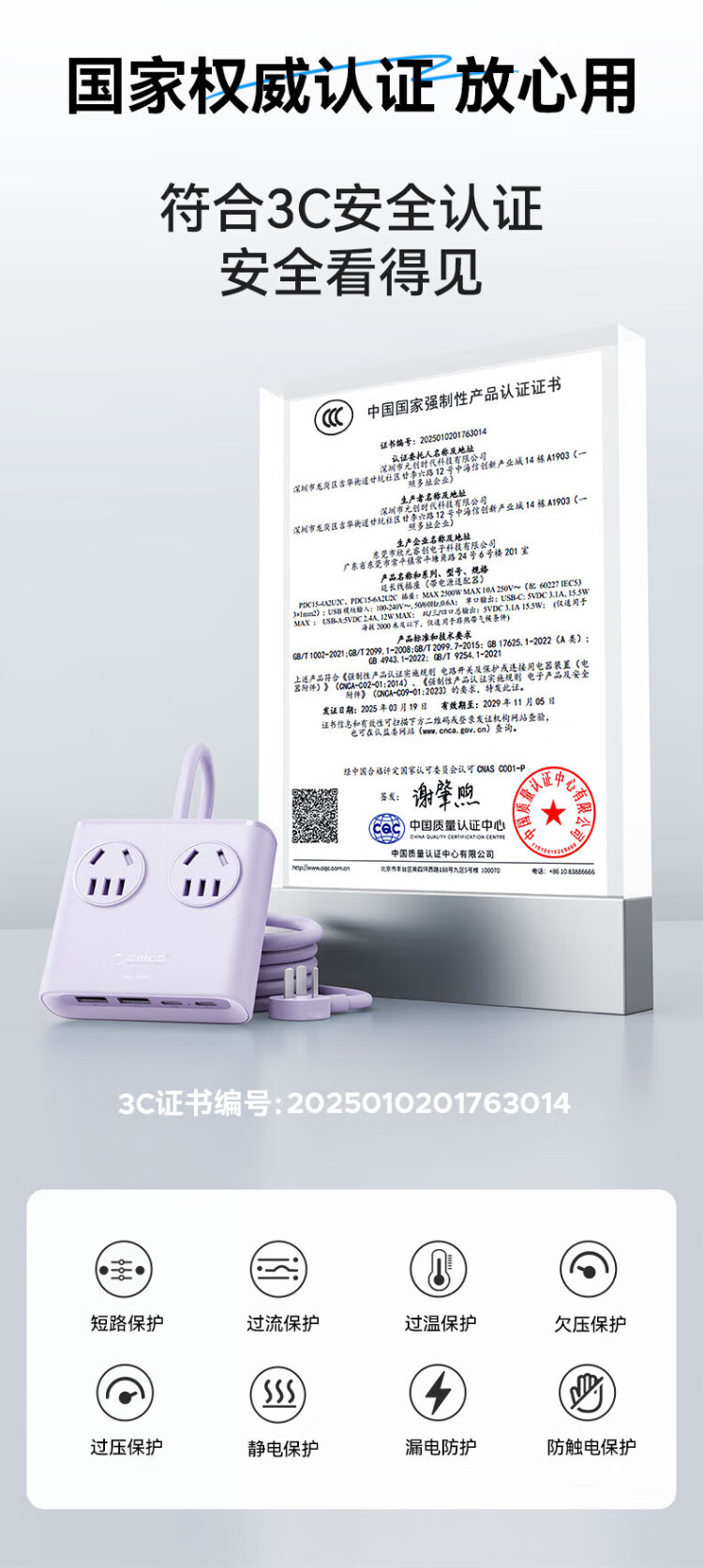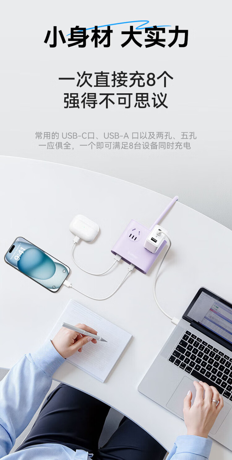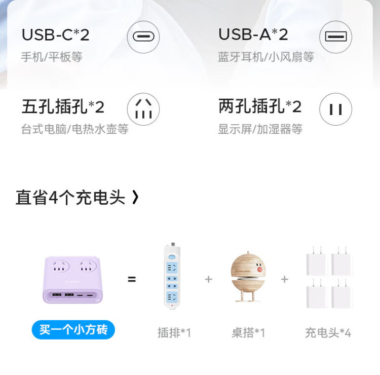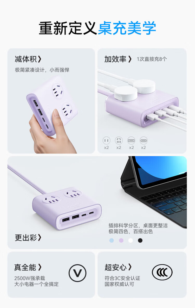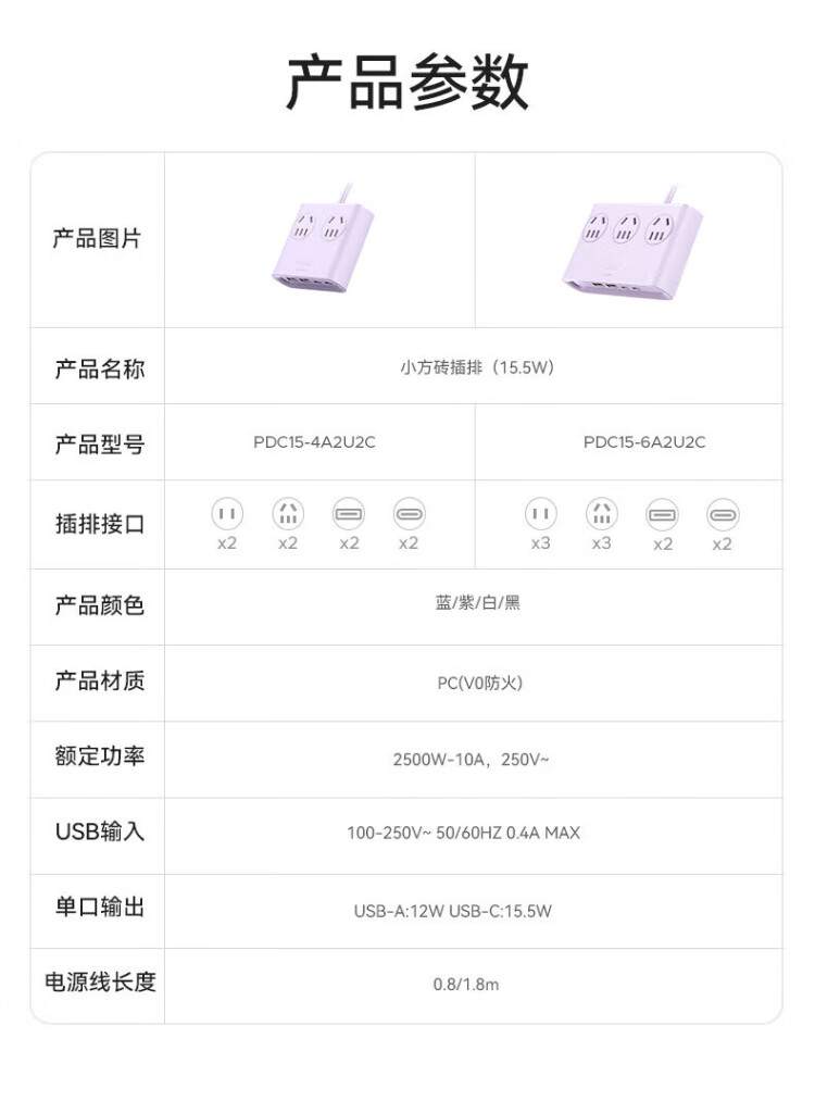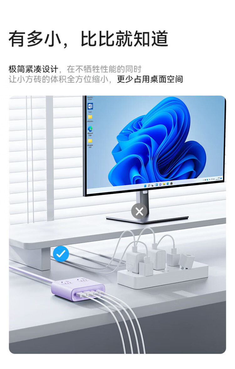 Orrick suitable for iphone17 small square brick desktop charging station plug-in USB socket multi-function plug-in board full length 0.8 meters purple