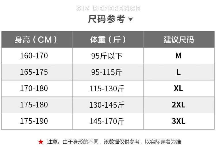 China (cm) 165 / 88-90 170 / 96-98 175 / 108-110 180 / 118-122 185 / 126-130
