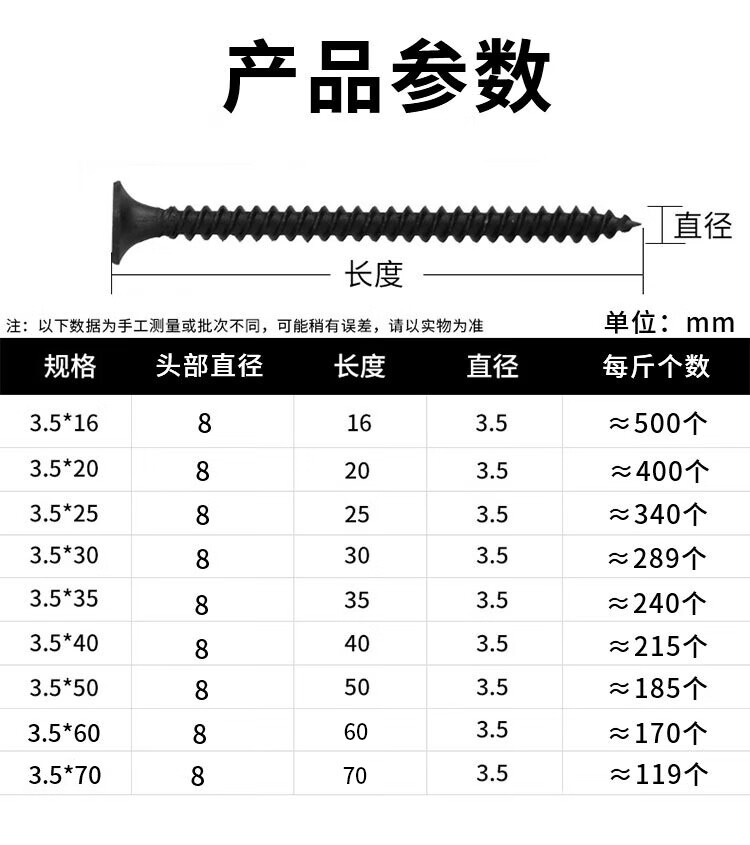 Masif dry wall screws, cross countersunk head self-tapping screws, black carbon steel wallboard nails, gypsum board nails, 3.5*30mm (1Jin Jin is equal to 0.5kg/pack)