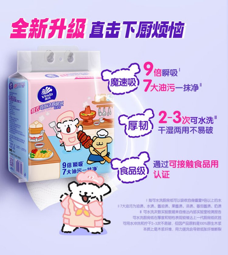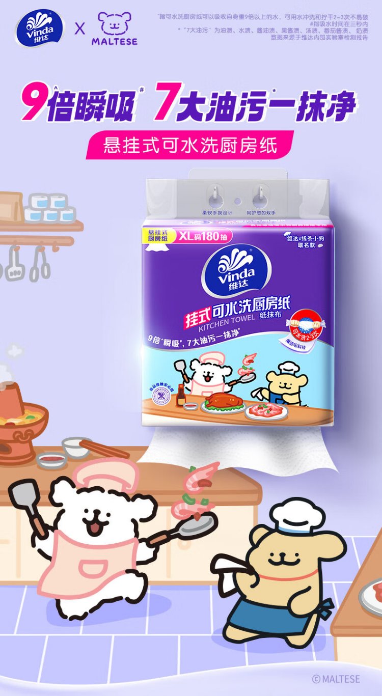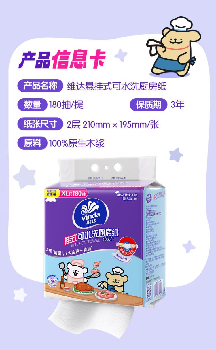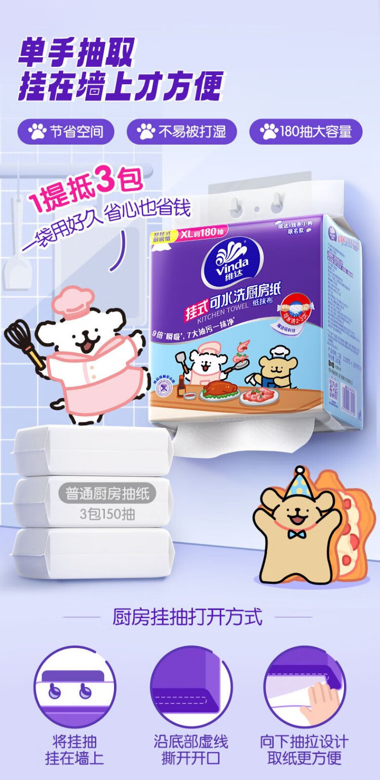 Vinda kitchen paper, food-contact grade, hanging tissue paper 180 sheets*6 packs, line puppy joint model