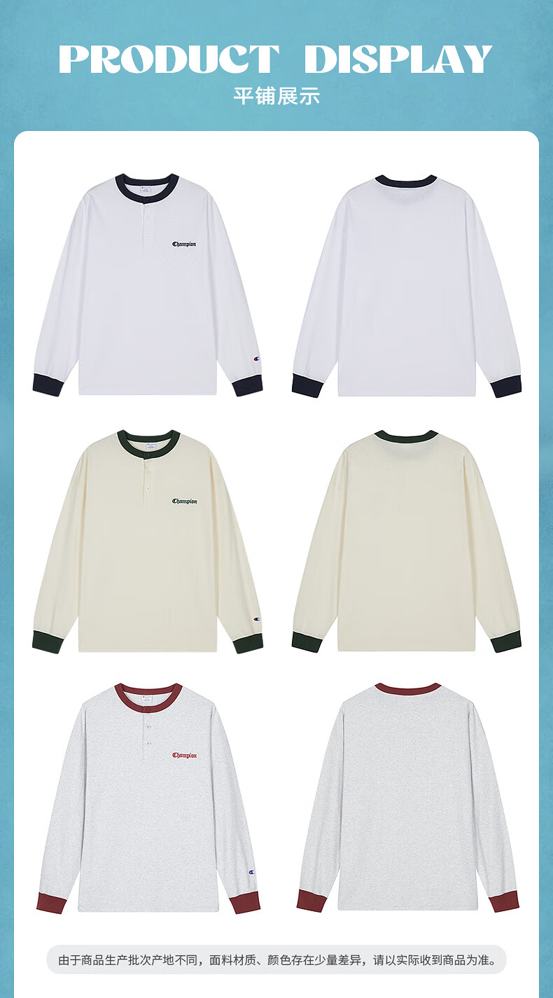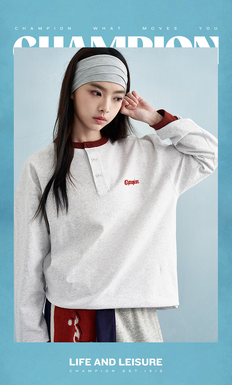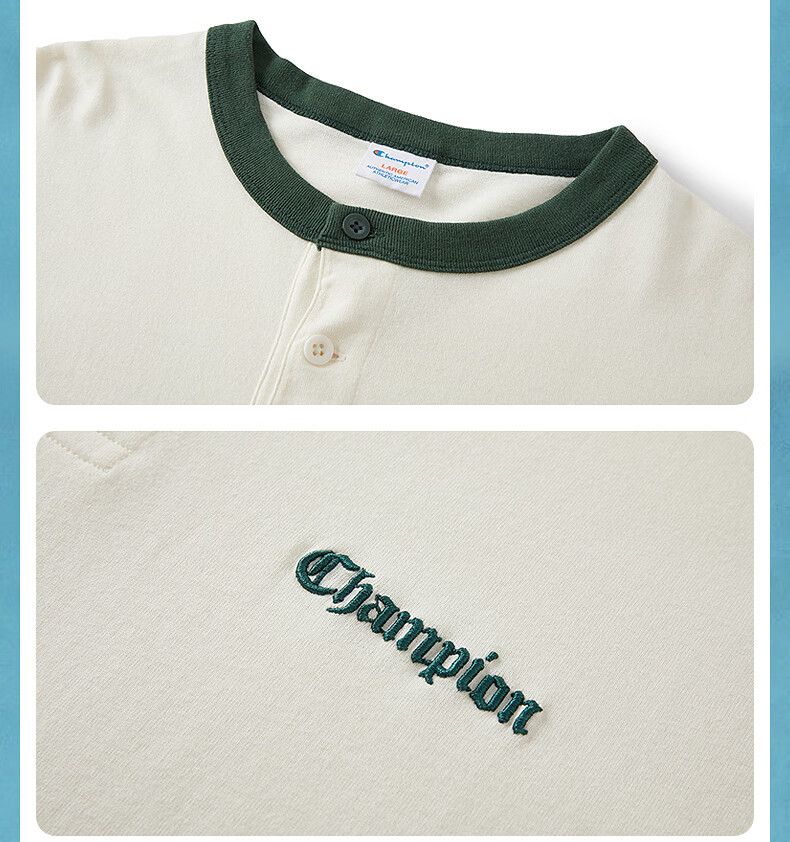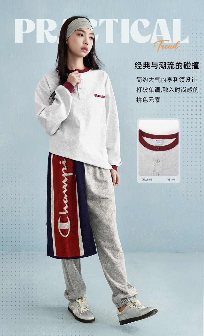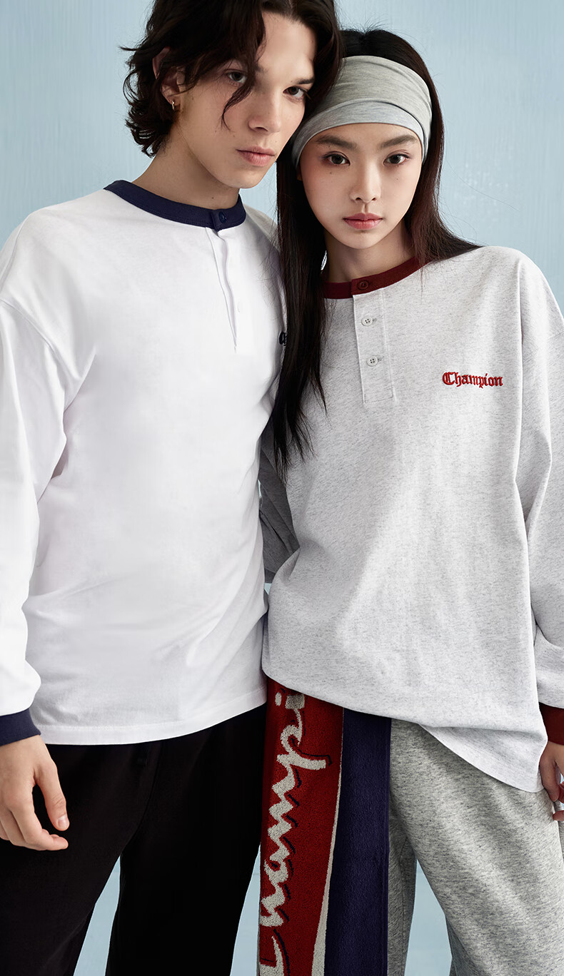 Champion long-sleeved T-shirt men's color-blocked Henry collar bottoming shirt pure cotton top women's twist gray L