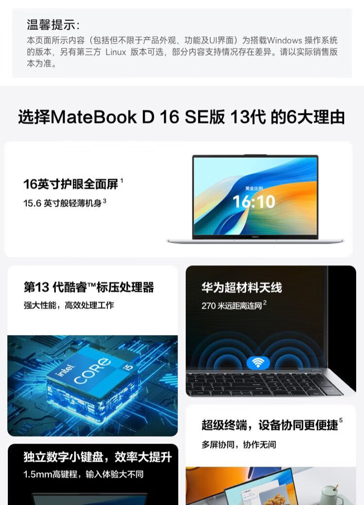 Huawei MateBook D 16 SE Linux version thin and light laptop 13th generation high-performance Core standard voltage processor i5 16G 1T Haoyue Silver