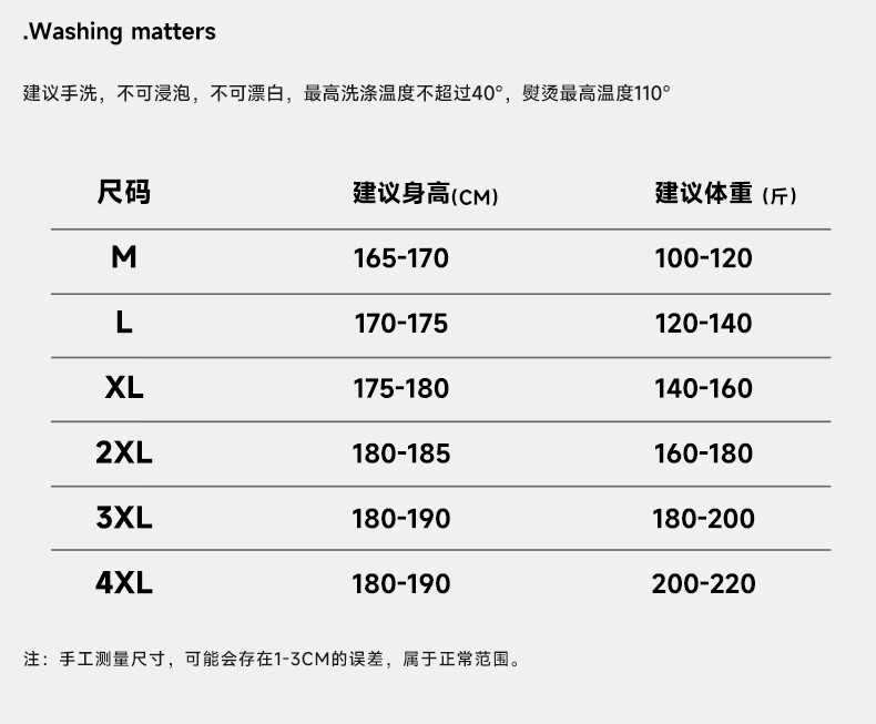 China (cm) 165 / 88-90 170 / 96-98 175 / 108-110 180 / 118-122 185 / 126-130