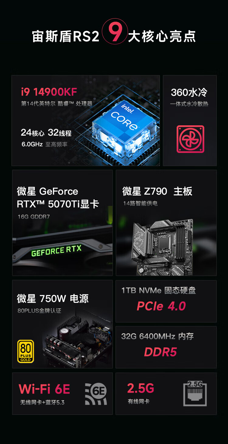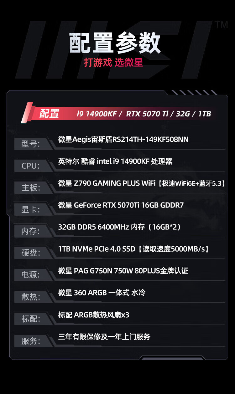 MSI Family Bucket Aegis RS2 14th generation i9 14900KF/RTX5070Ti/32G D5/1T water-cooled e-sports gaming desktop computer host complete machine national subsidy
