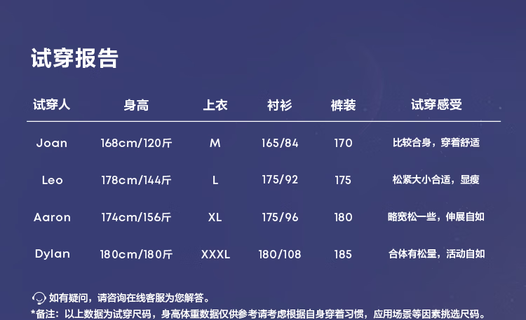 China (cm) 165 / 88-90 170 / 96-98 175 / 108-110 180 / 118-122 185 / 126-130