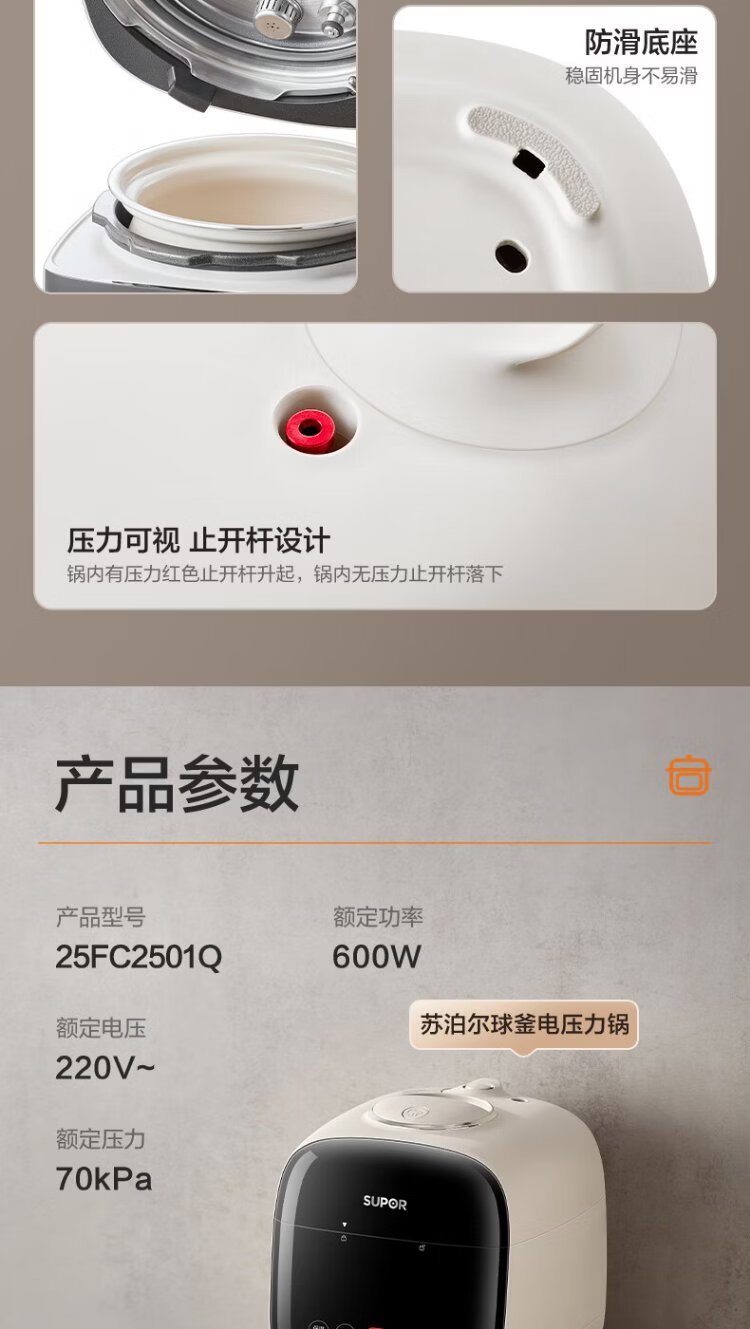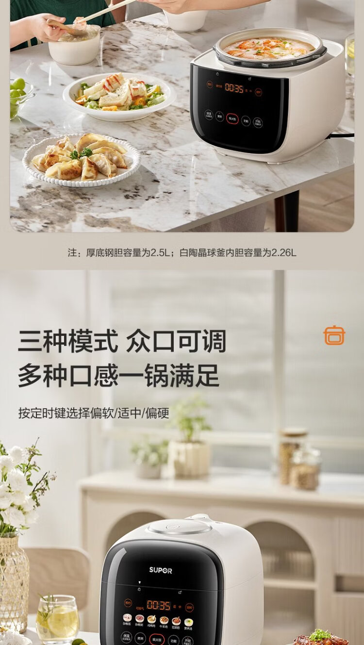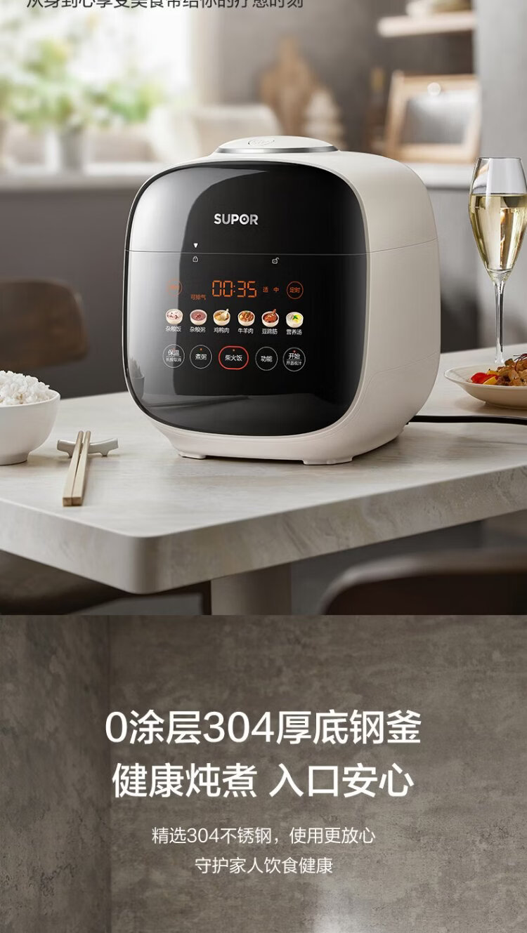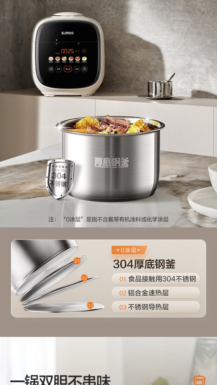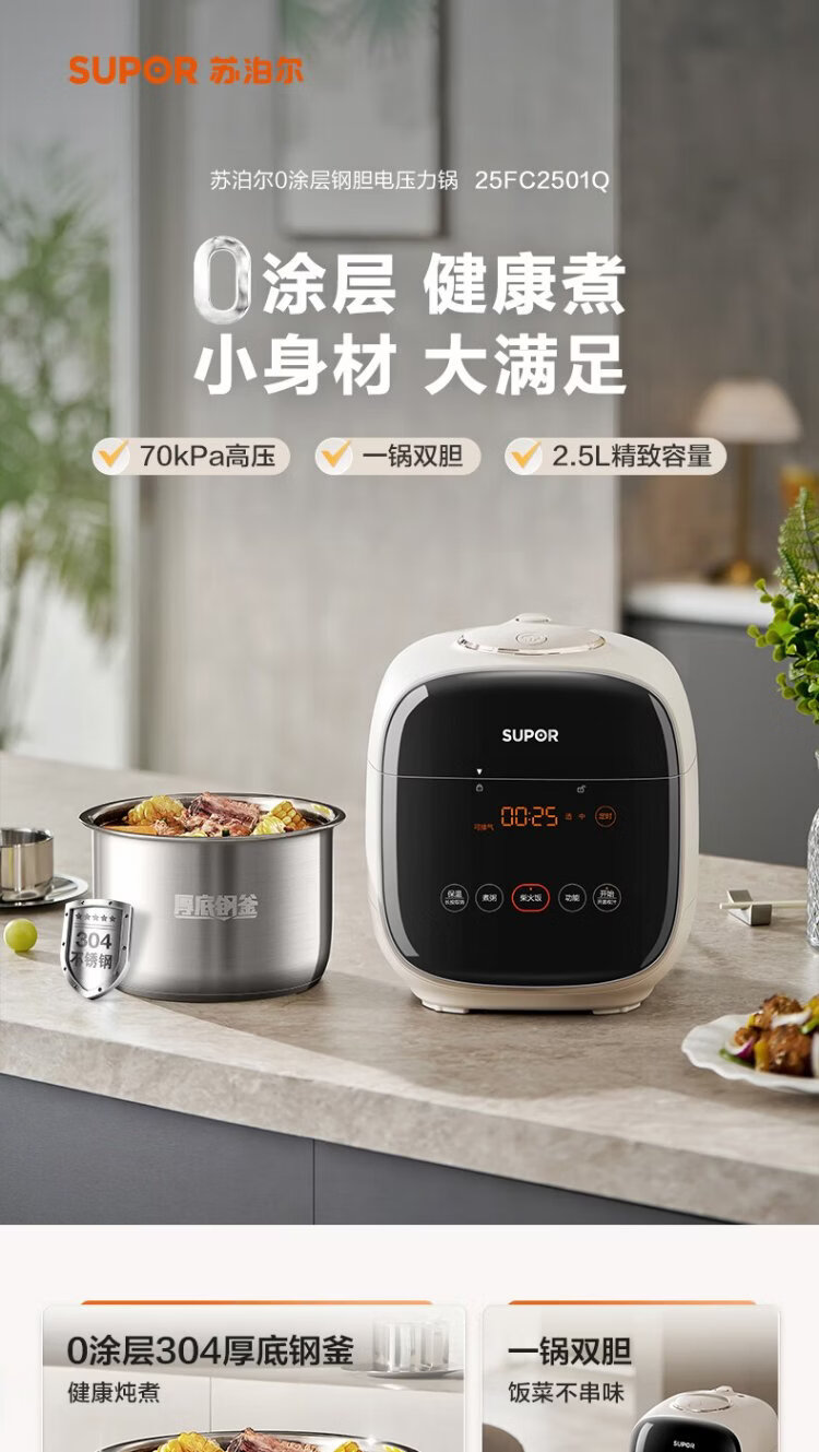 SUPOR 0-coated stainless steel ball kettle electric pressure cooker 2.5L household smart touch display SY-25FC2501Q double-gallon rice cooker pressure cooker for 1-3 people