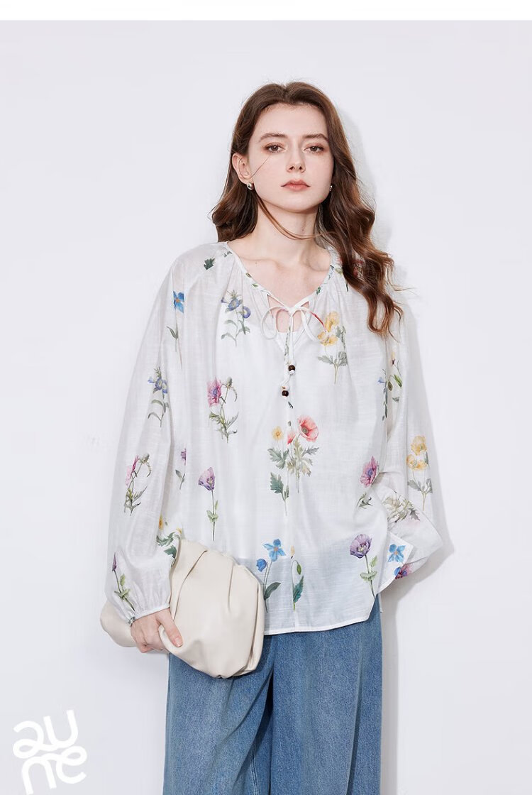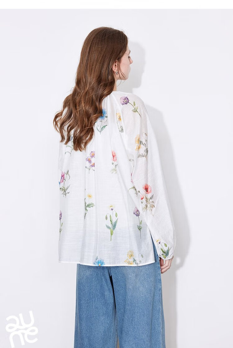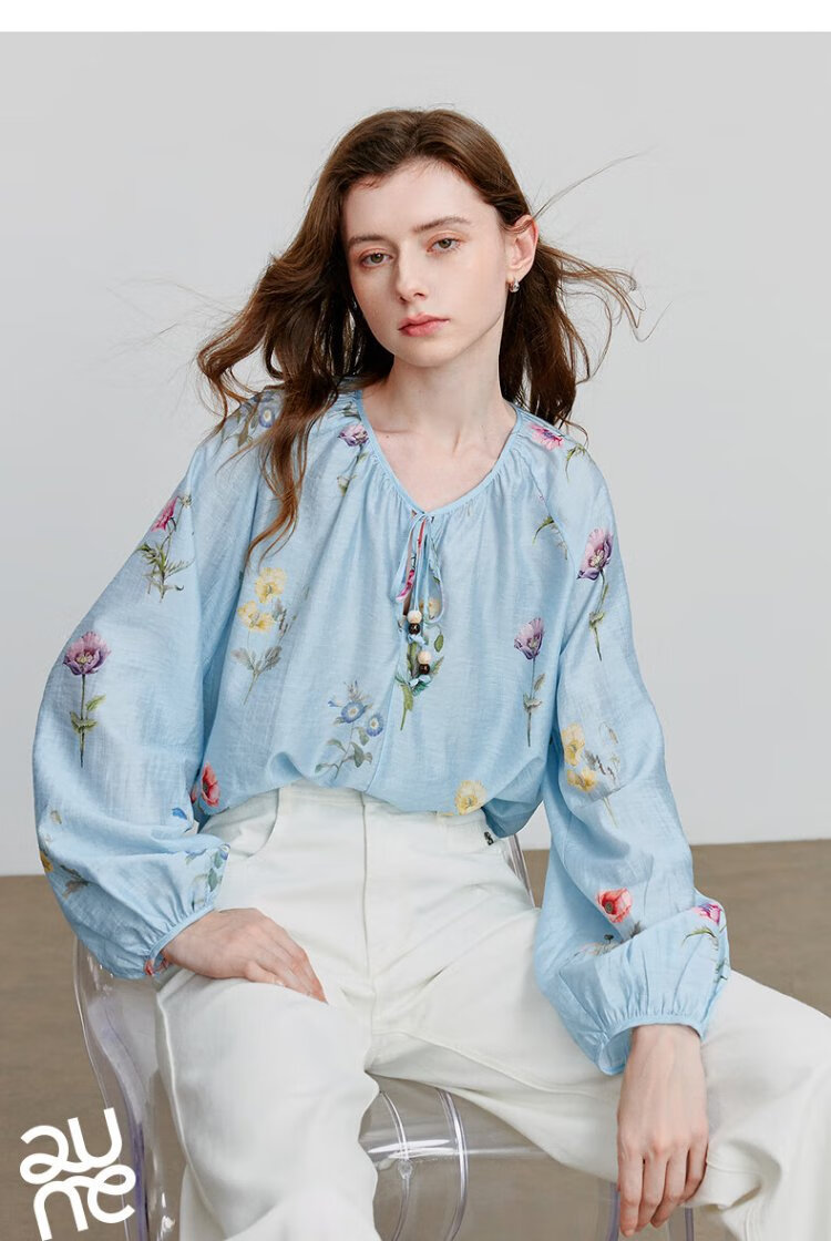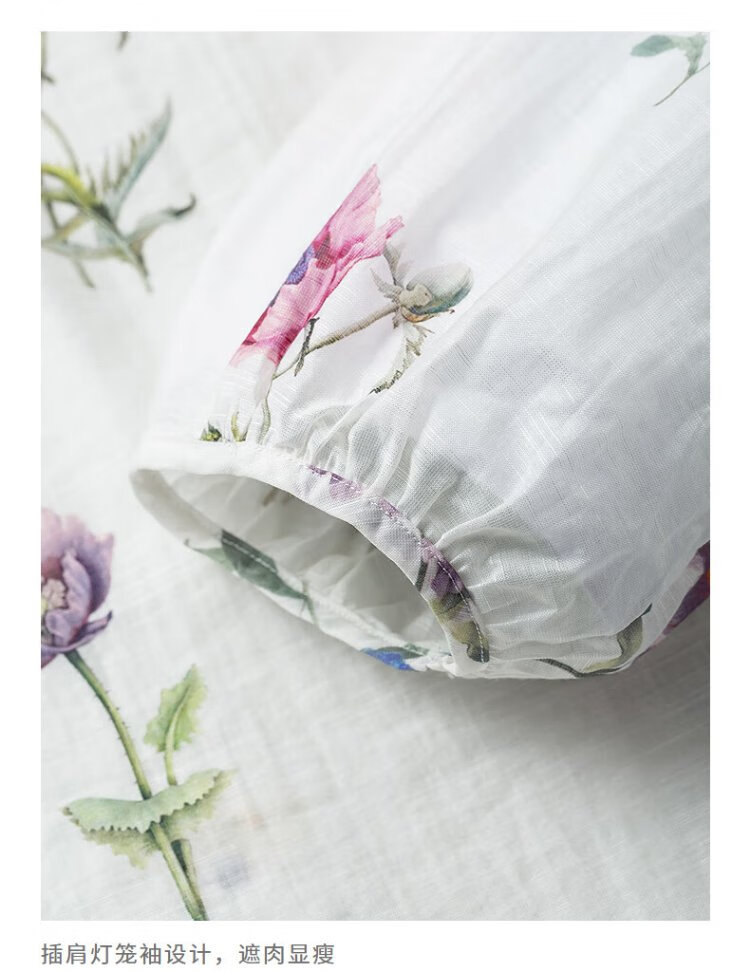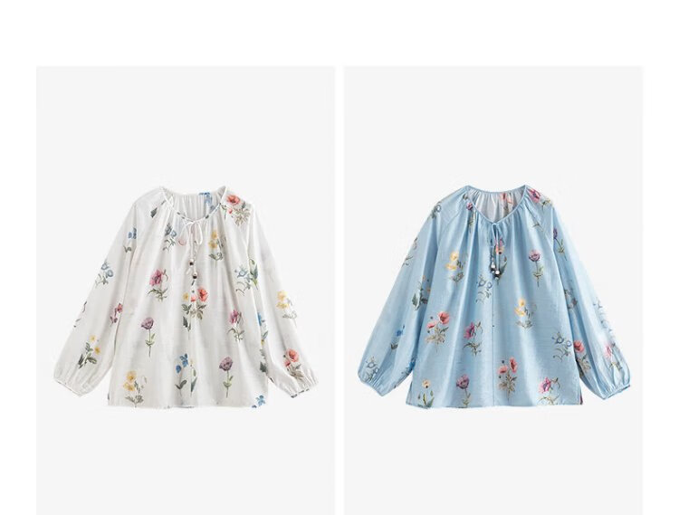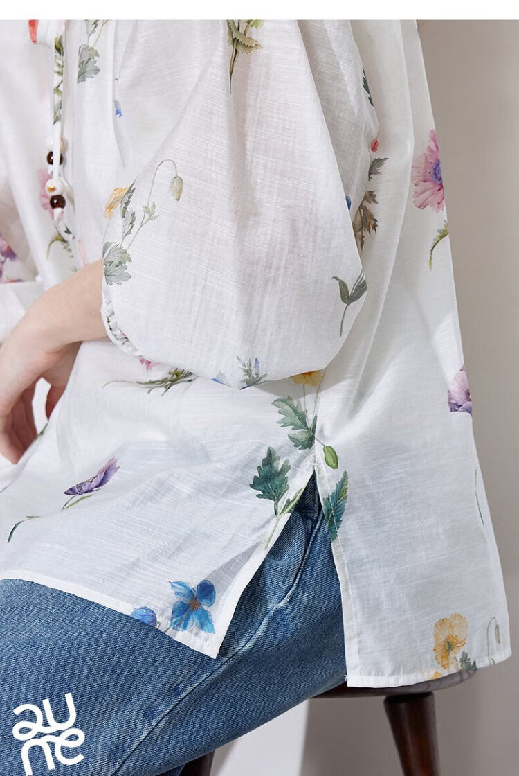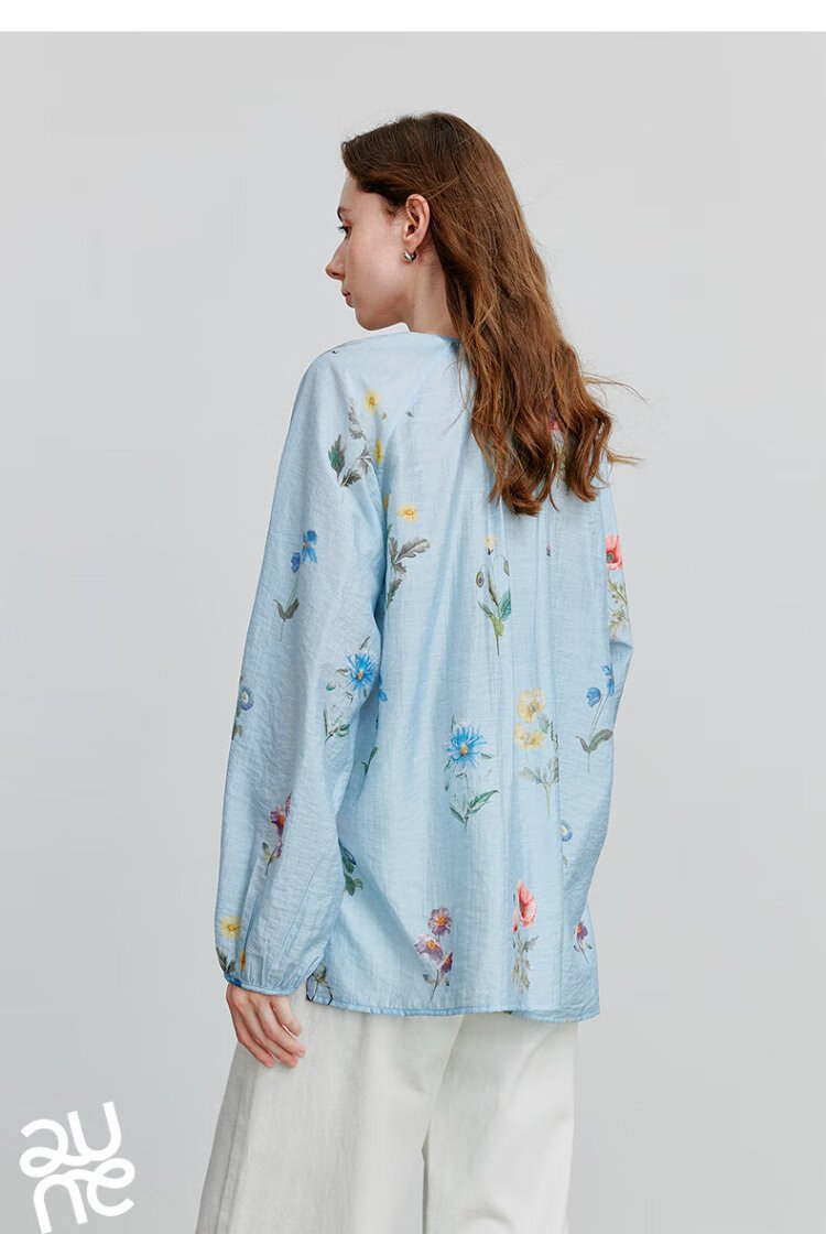 Chuyu Small Fresh Linen Printed Shirt Women's 2025 Spring New Loose Shirt Top Blue Bottom Green Velvet XL
