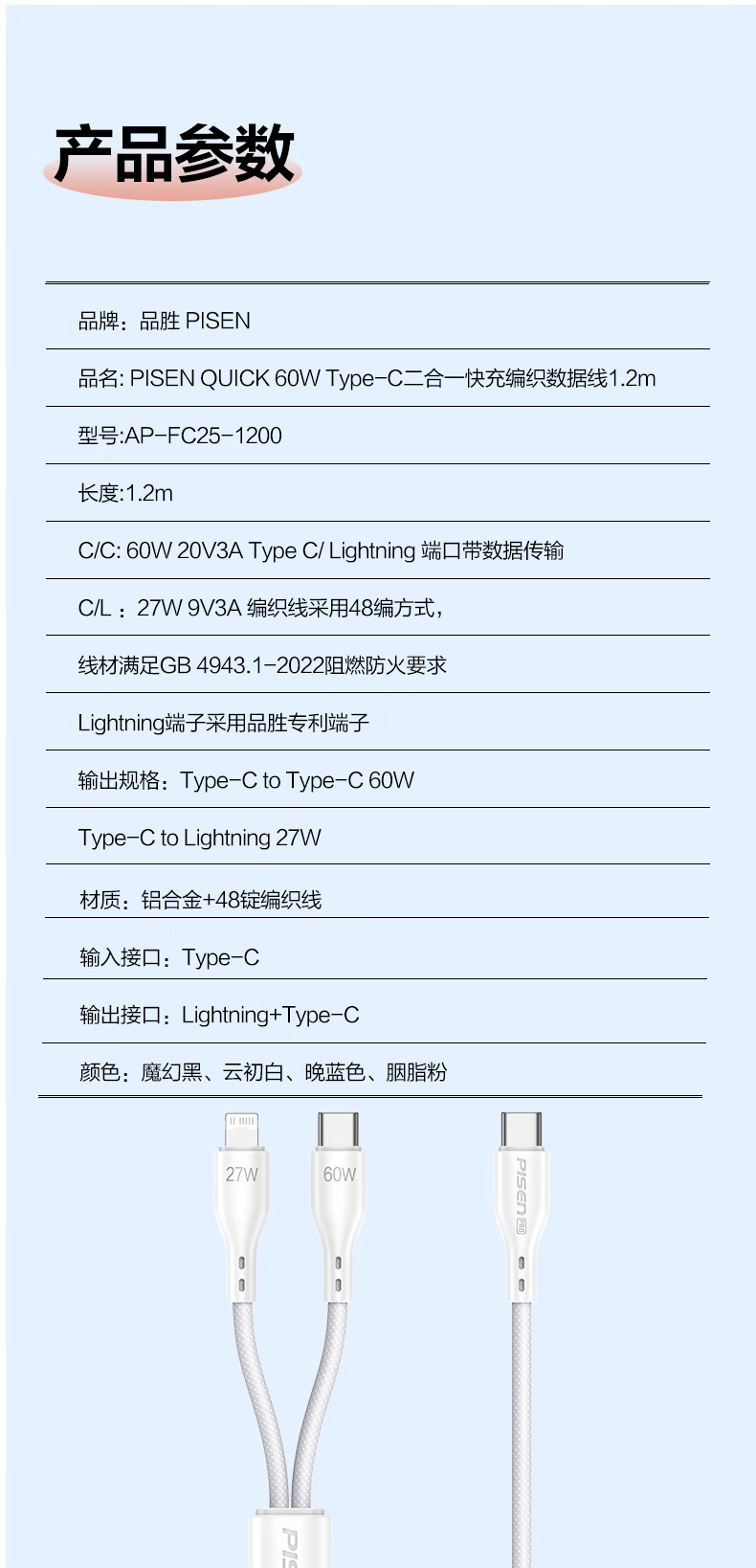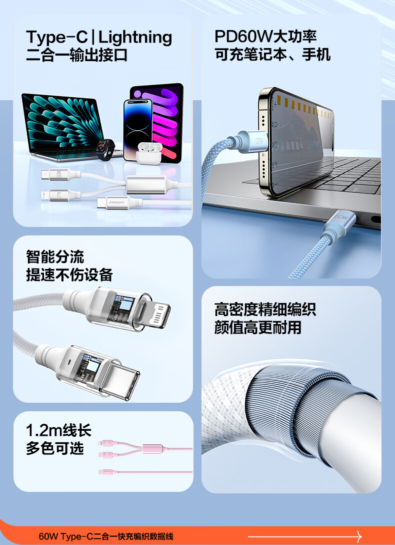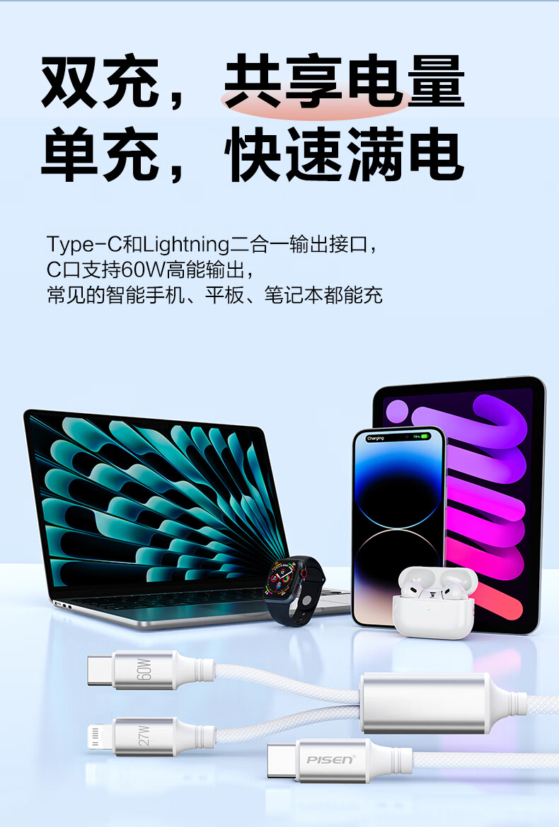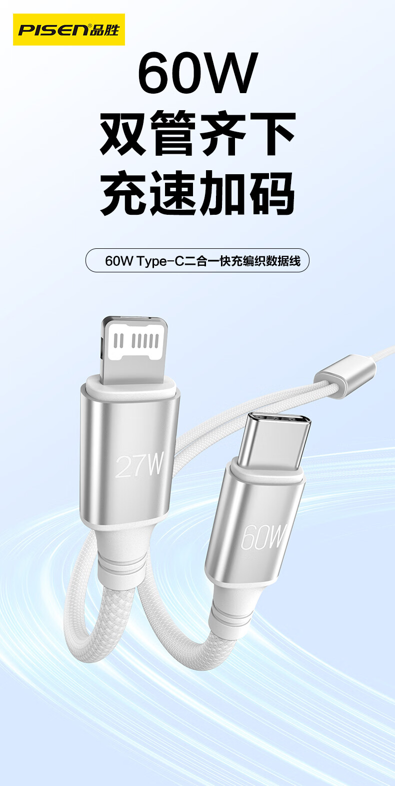 Pinsheng dual Type-C data cable two-in-one PD60W/27W charging cable fast charging one-to-two multi-head car suitable for Apple 17/16/15 mobile phone iPad Huawei Xiaomi computer