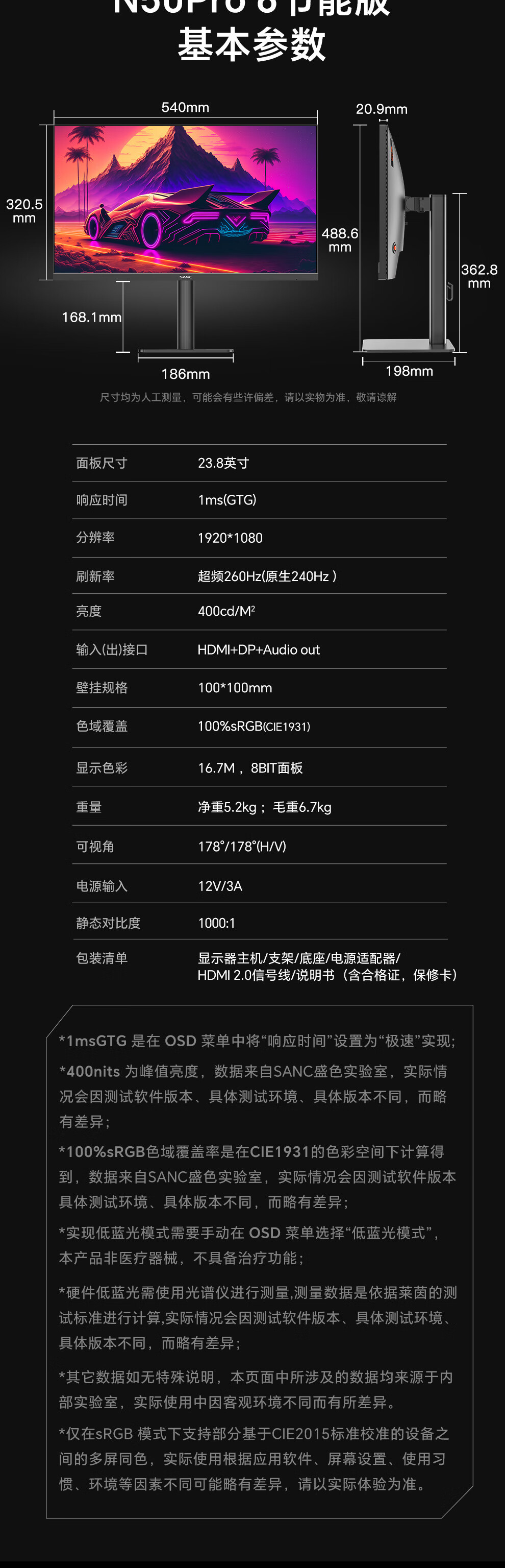 SANC Shengse 23.8-inch 260Hz overclocking hardware low blue light FastIPS e-sports display HDR400nit rotating lifting computer screen N50Pro6 energy-saving version