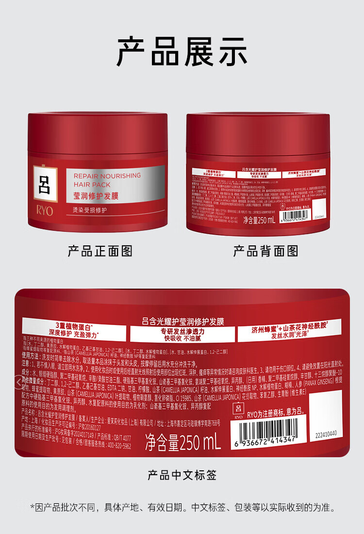 Ryo Honglu repair damage, improve frizz, smooth and shine hair mask 250ml