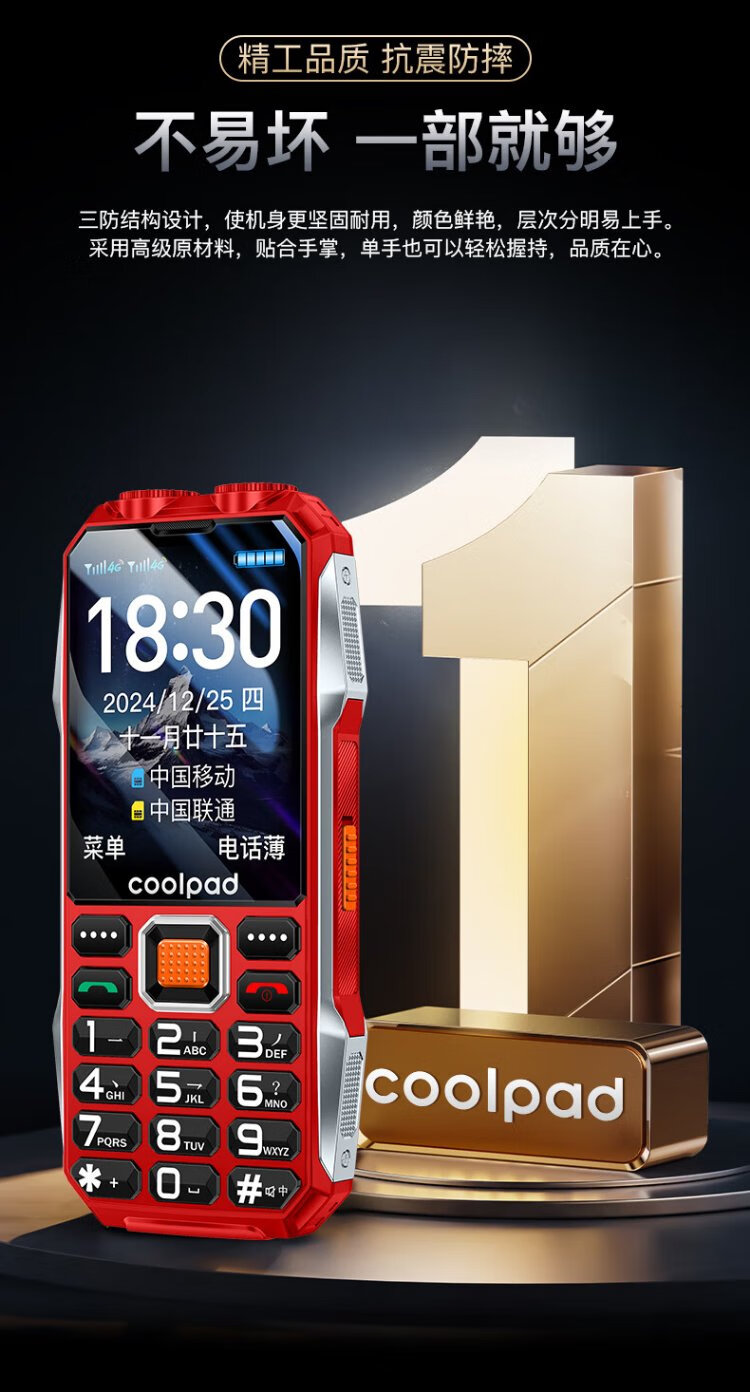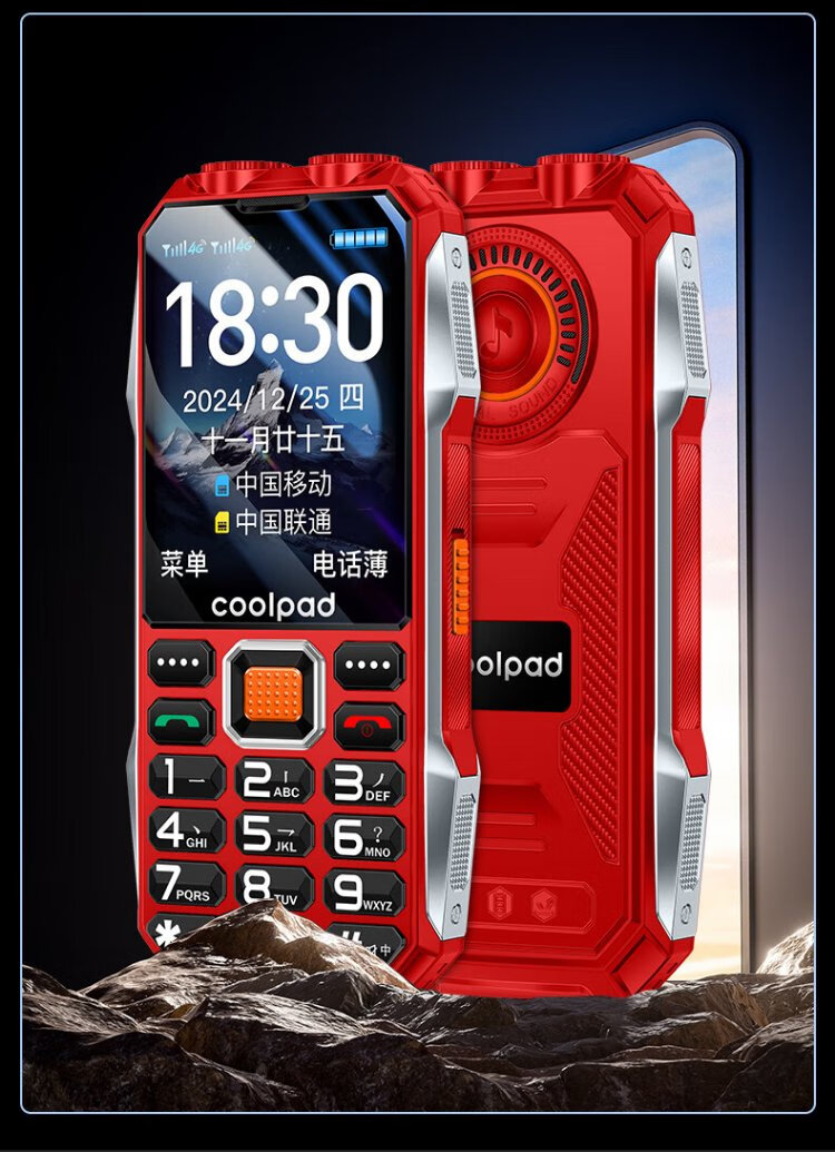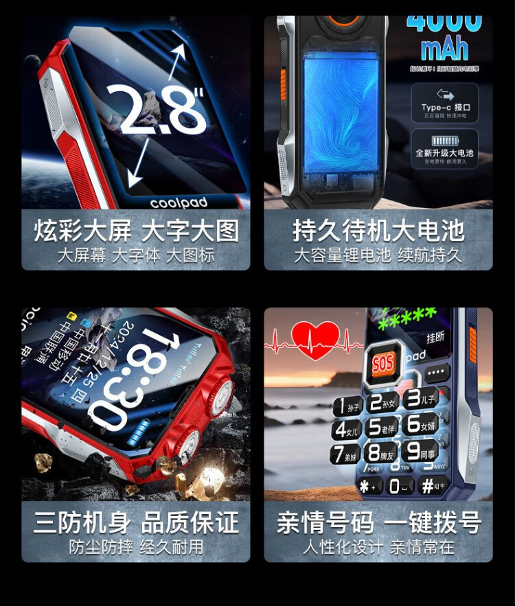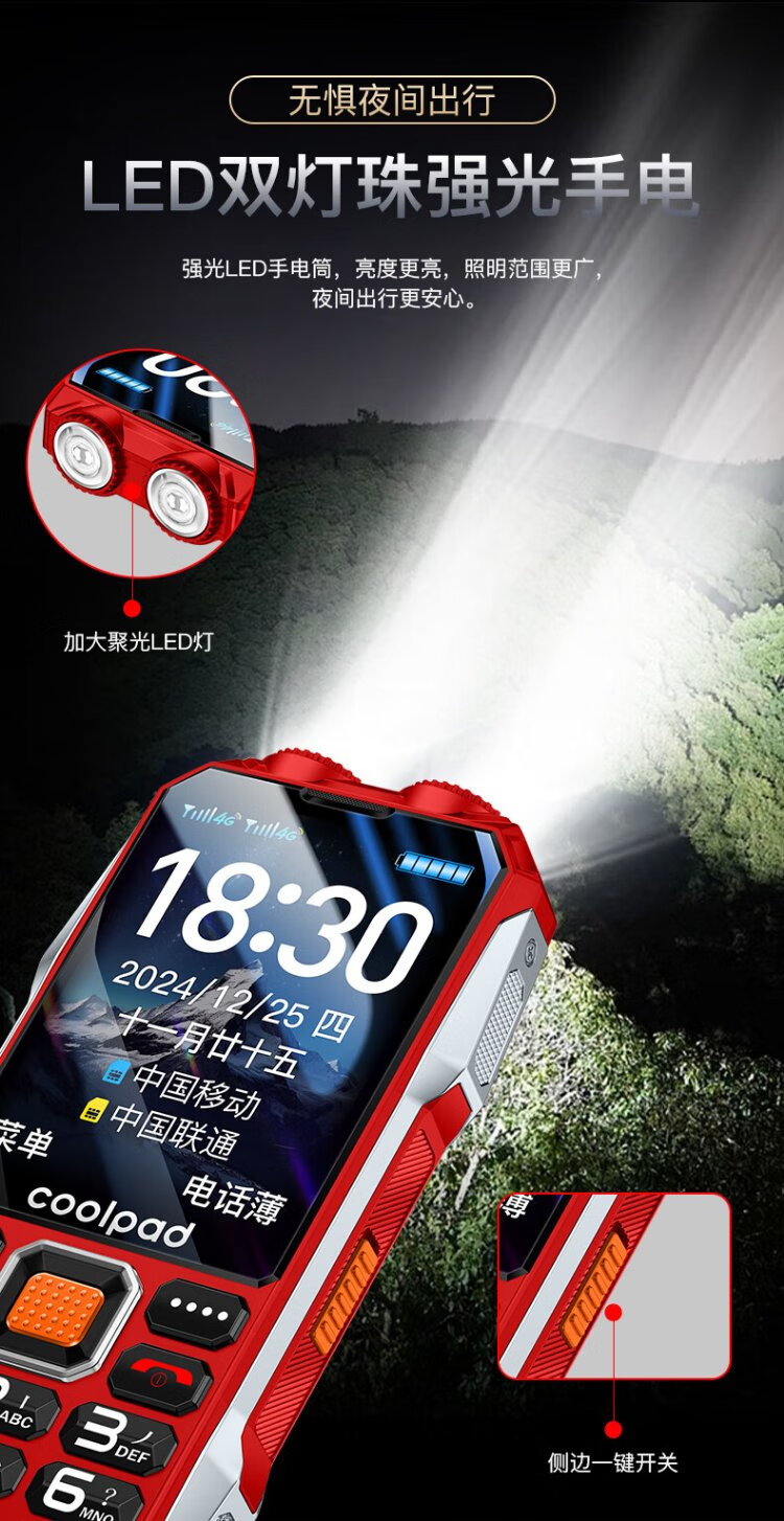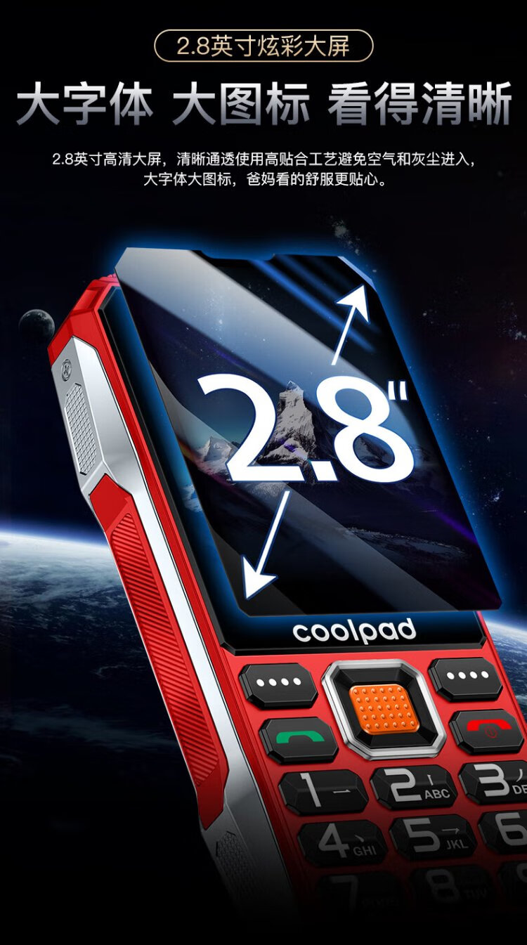 Coolpad three-proof elderly phone 4G full network communication large battery super long standby special mobile phone for the elderly anti-seismic and fall-proof new large screen big characters big sound button function phone K68 red