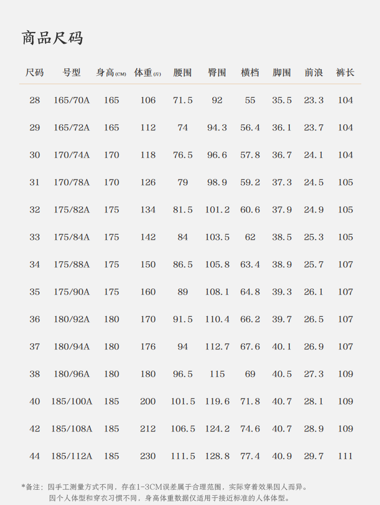 China (cm) 165 / 88-90 170 / 96-98 175 / 108-110 180 / 118-122 185 / 126-130