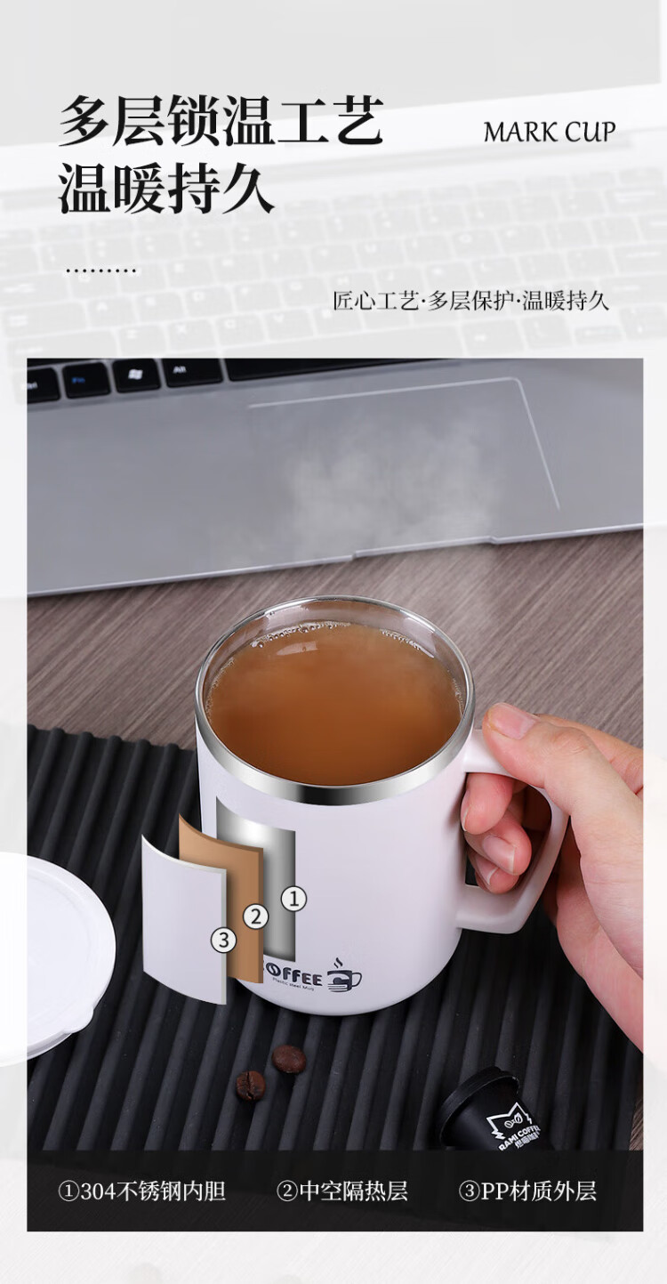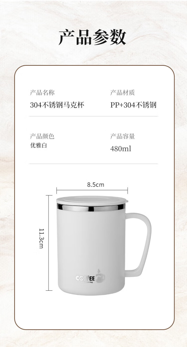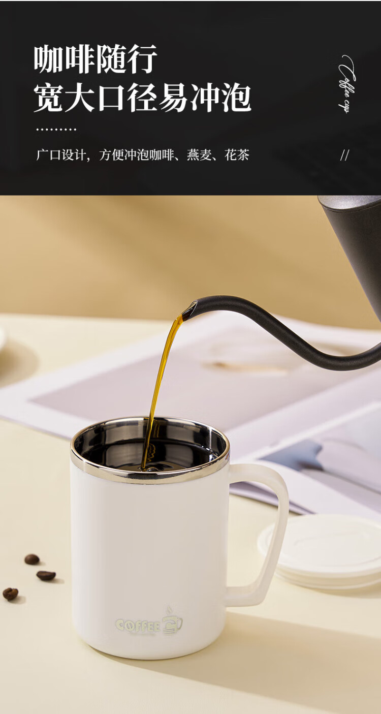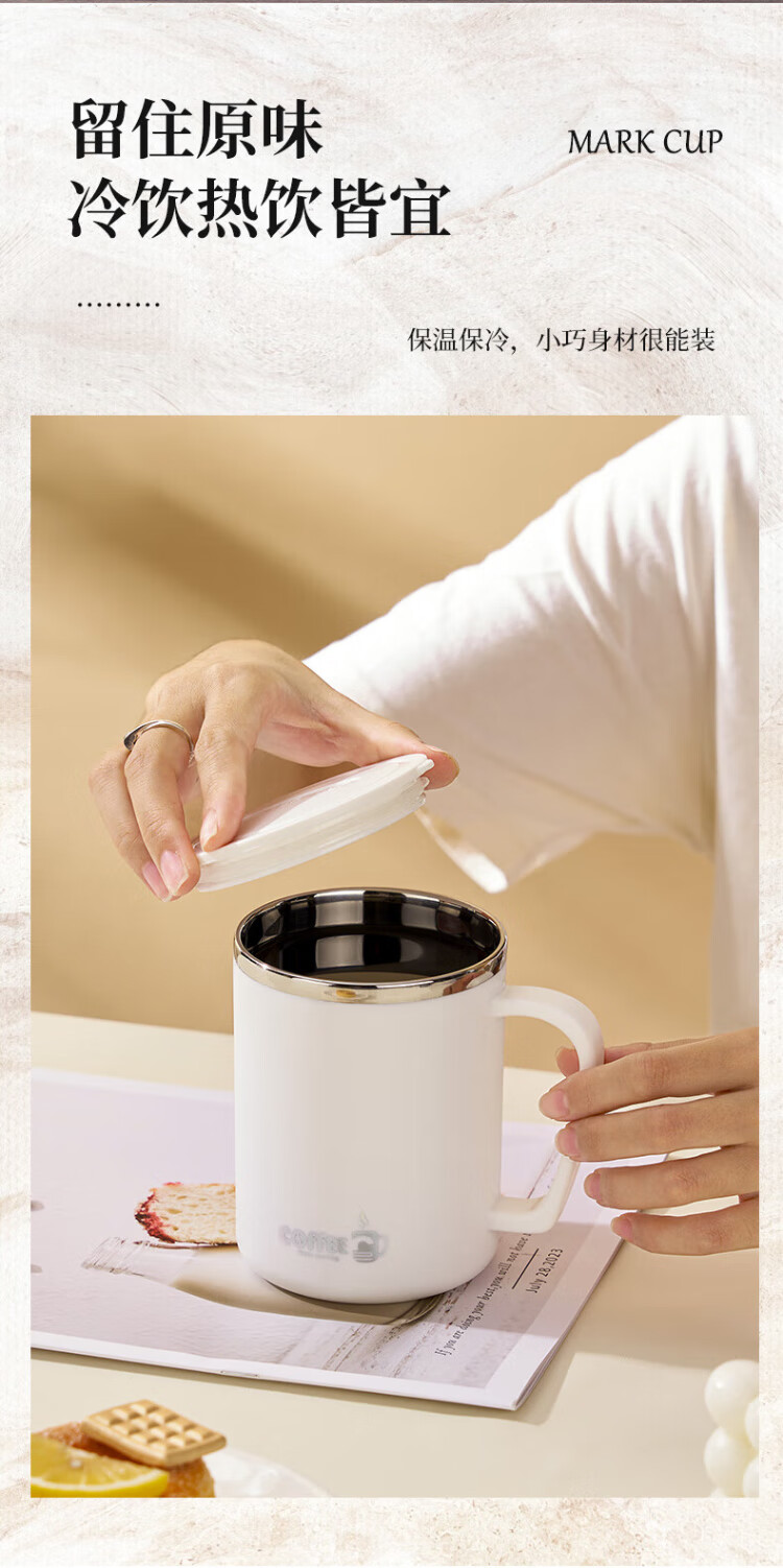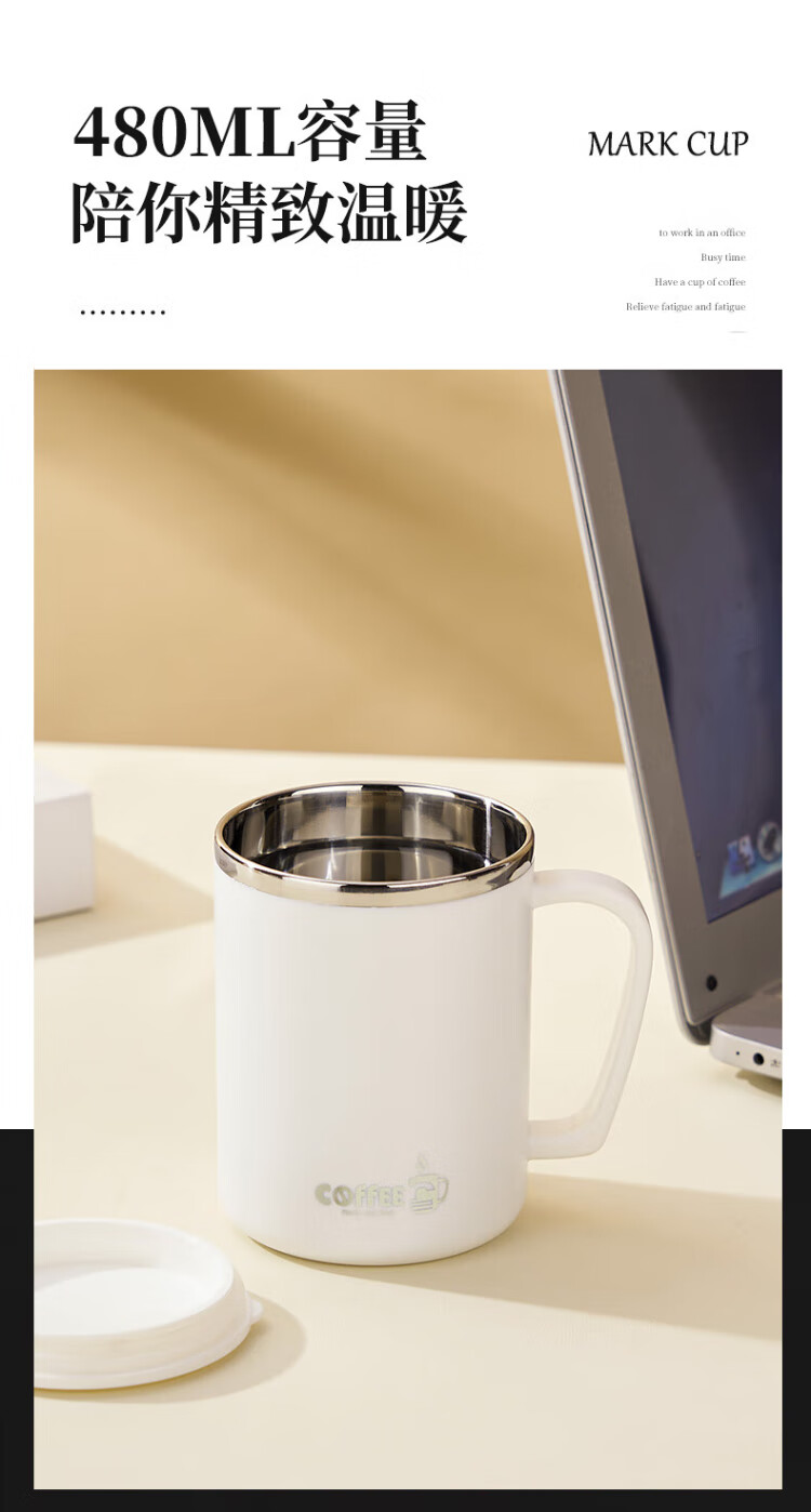Youlaifu 304 stainless steel water cup mug coffee cup with lid household double-layer anti-scald drinking cup white