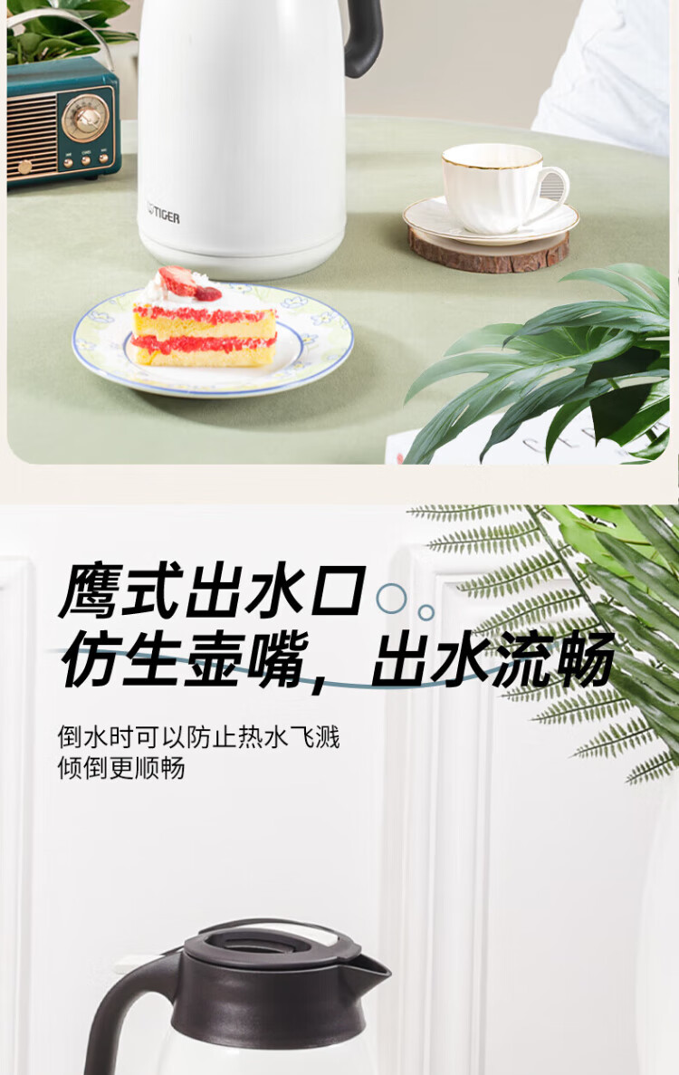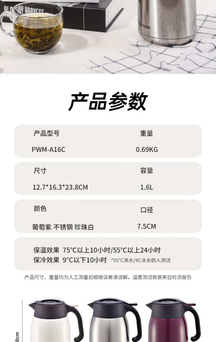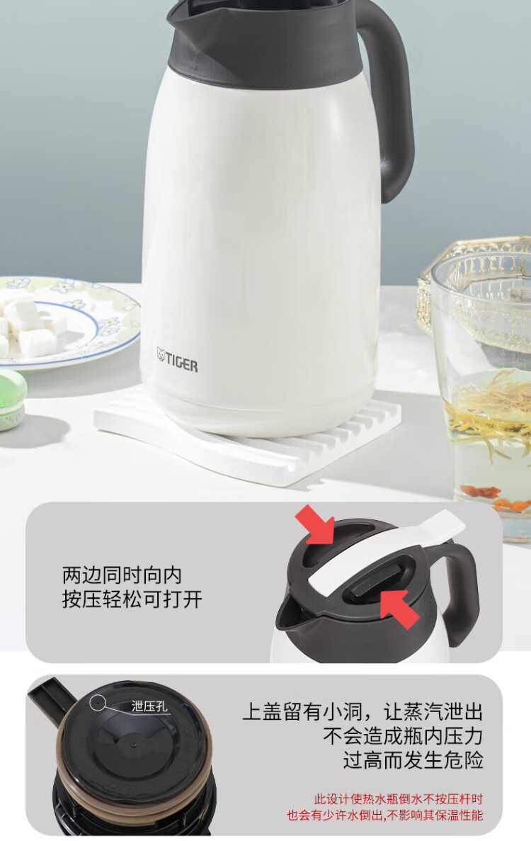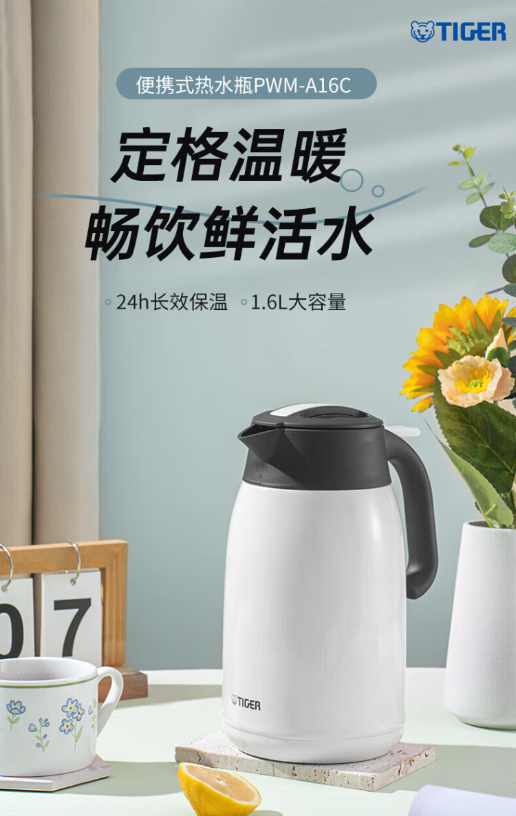 TIGER Stainless Steel Portable Thermos Vacuum Insulated Kettle PWM-A16C-CA Pearl White 1.6L