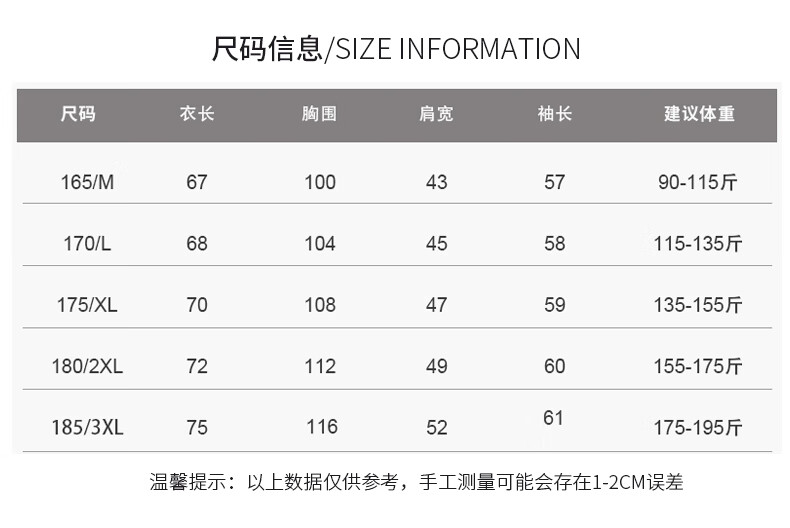 China (cm) 165 / 88-90 170 / 96-98 175 / 108-110 180 / 118-122 185 / 126-130