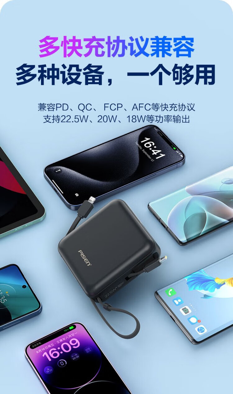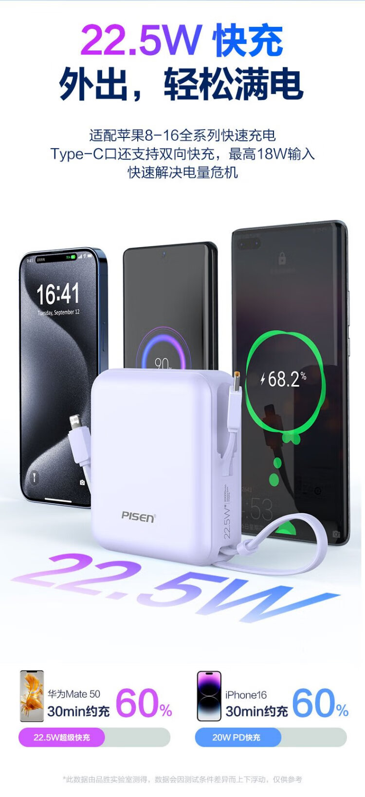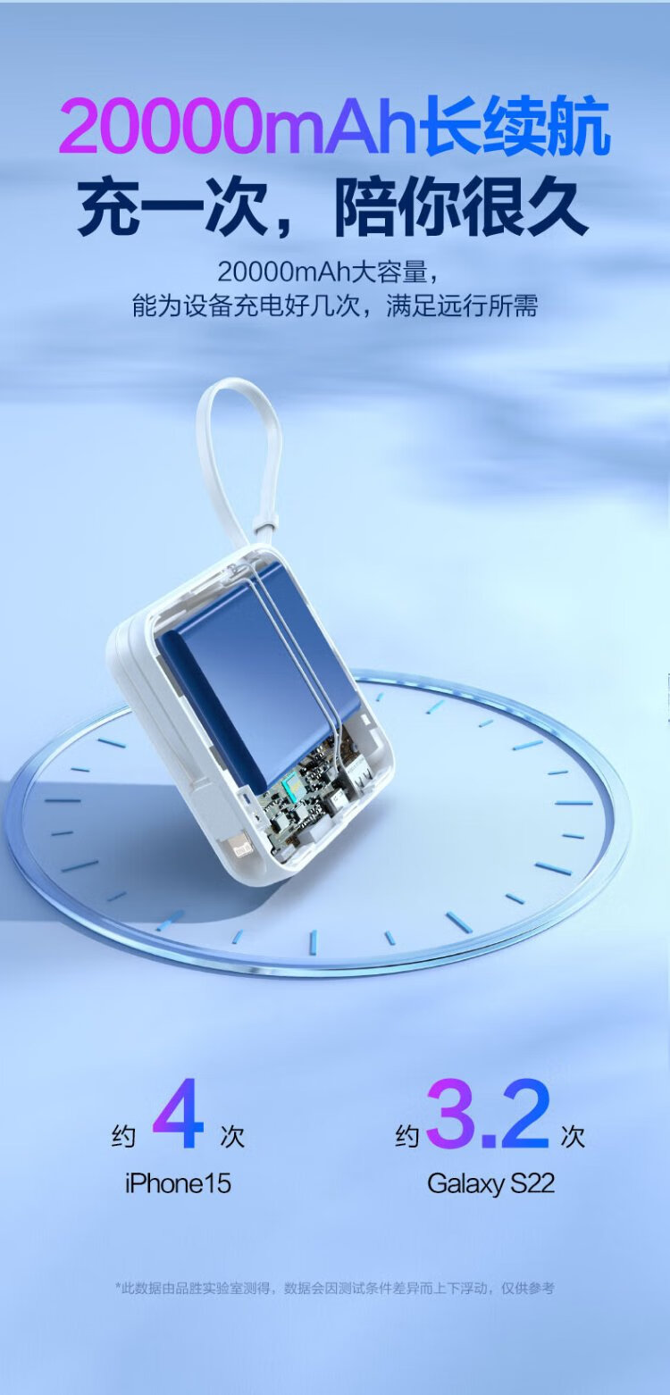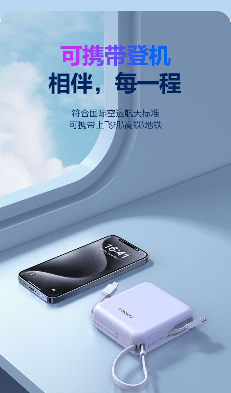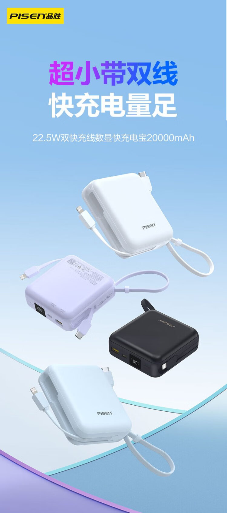 Pinsheng 3C certified power bank comes with dual-wire 20000 mAh large capacity and can be used on airplanes 22.5W fast charging mobile power supply suitable for Apple 17promax Xiaomi Huawei Purple