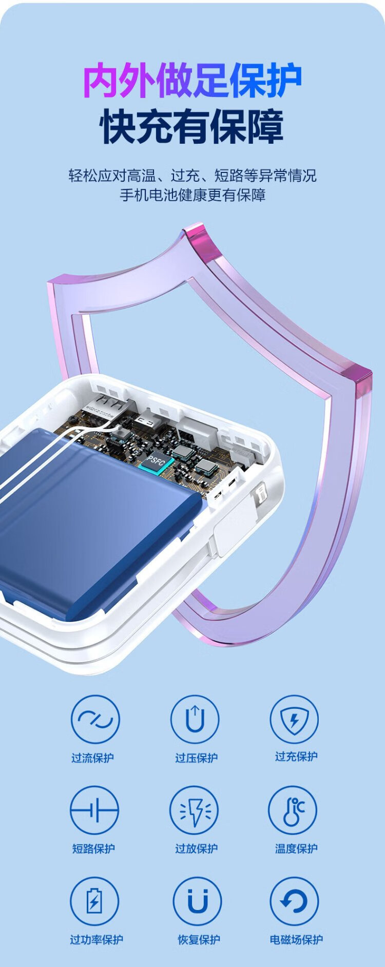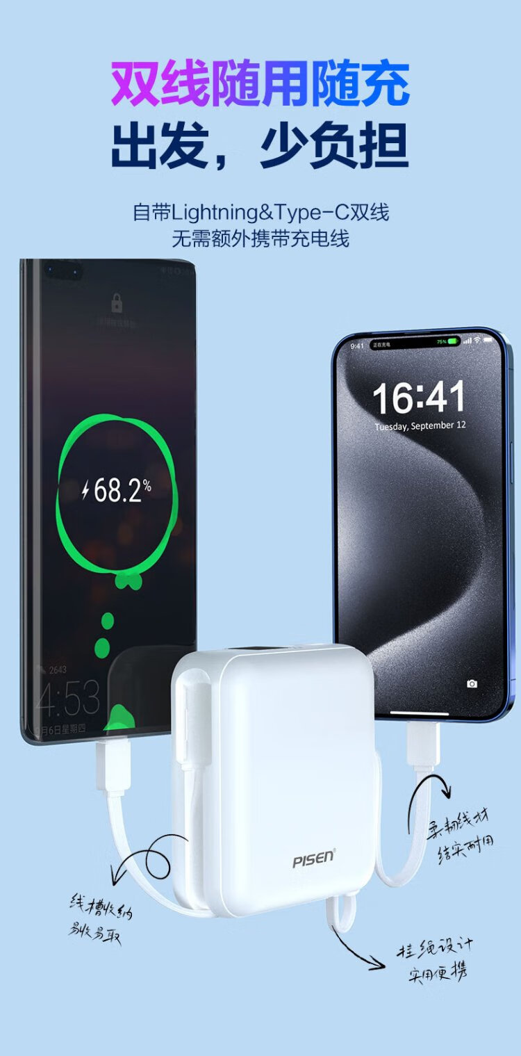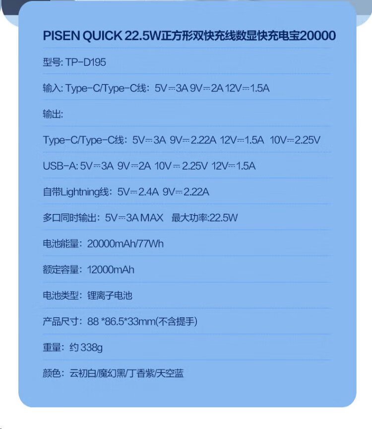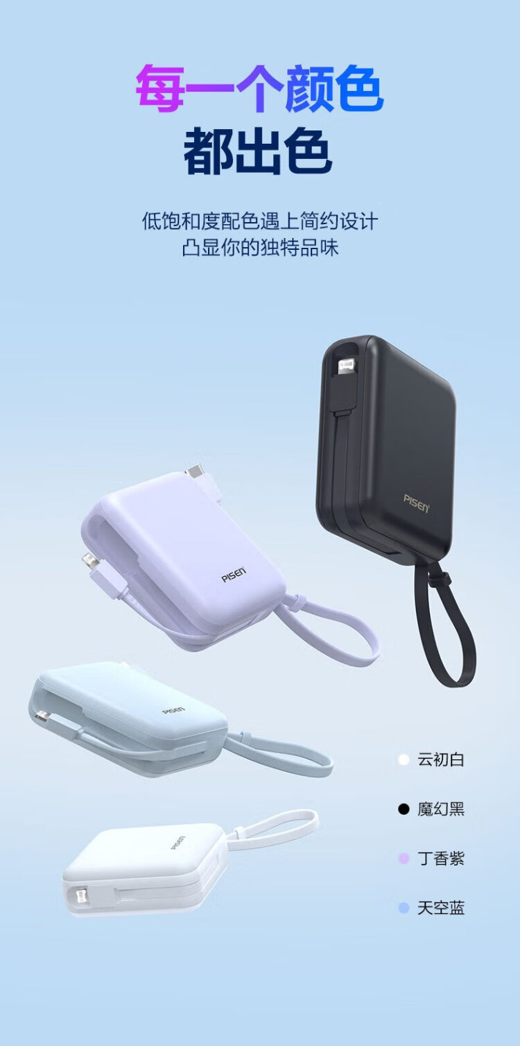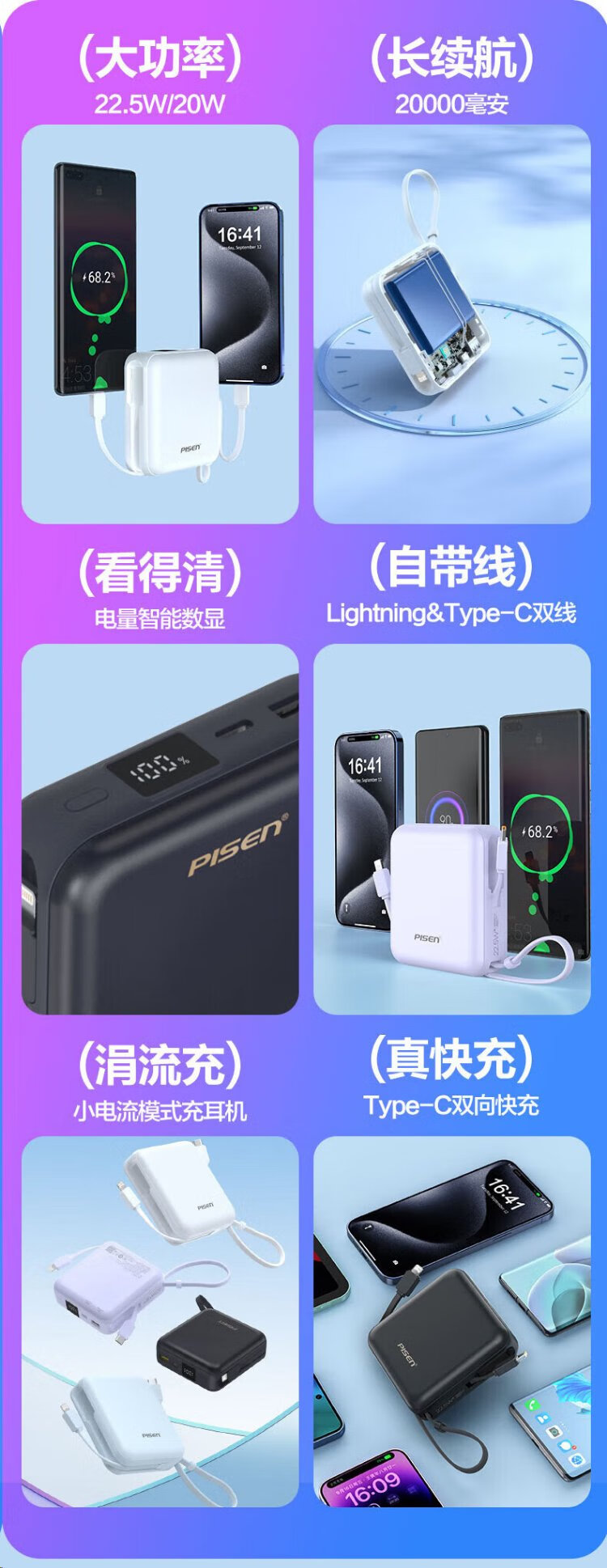 Pinsheng 3C certified power bank comes with dual-wire 20000 mAh large capacity and can be used on airplanes 22.5W fast charging mobile power supply suitable for Apple 17promax Xiaomi Huawei Purple