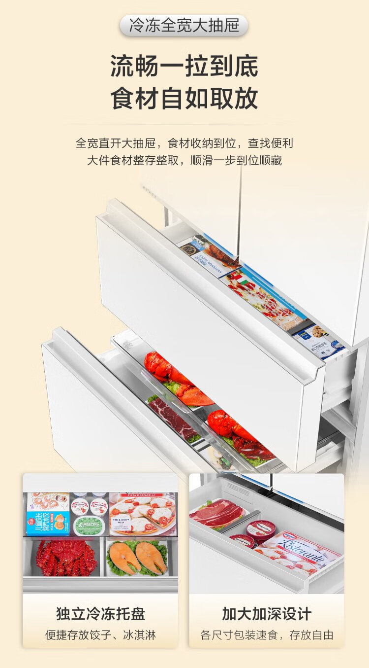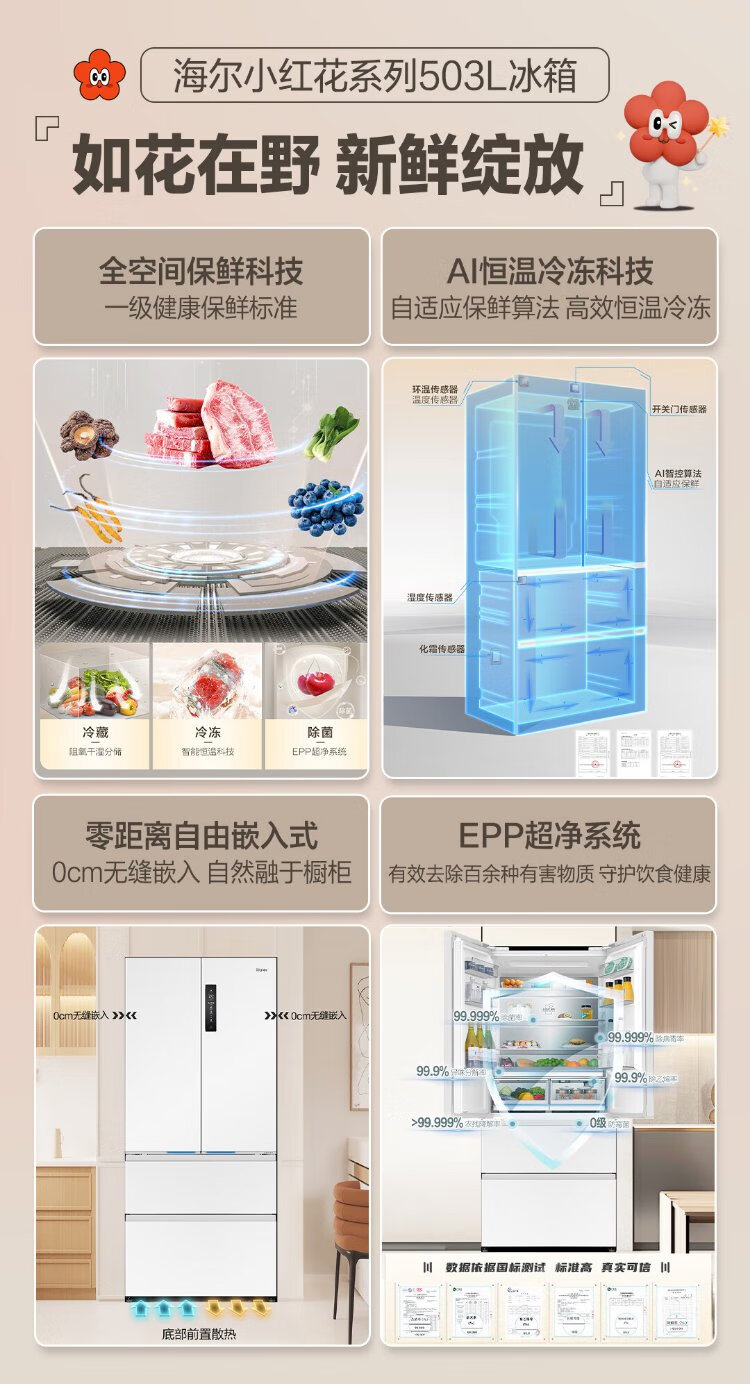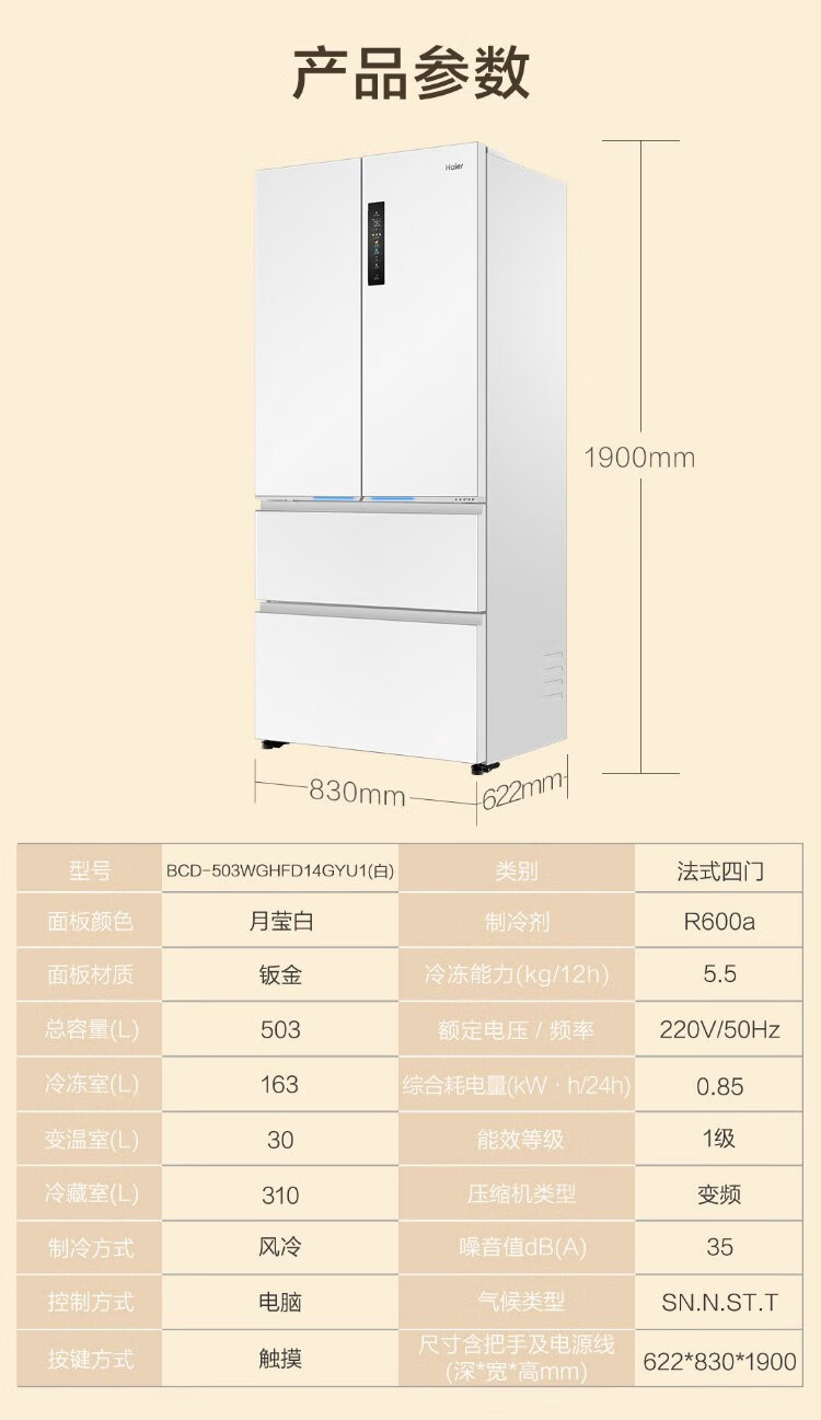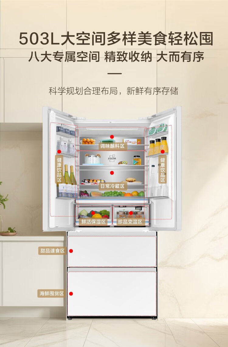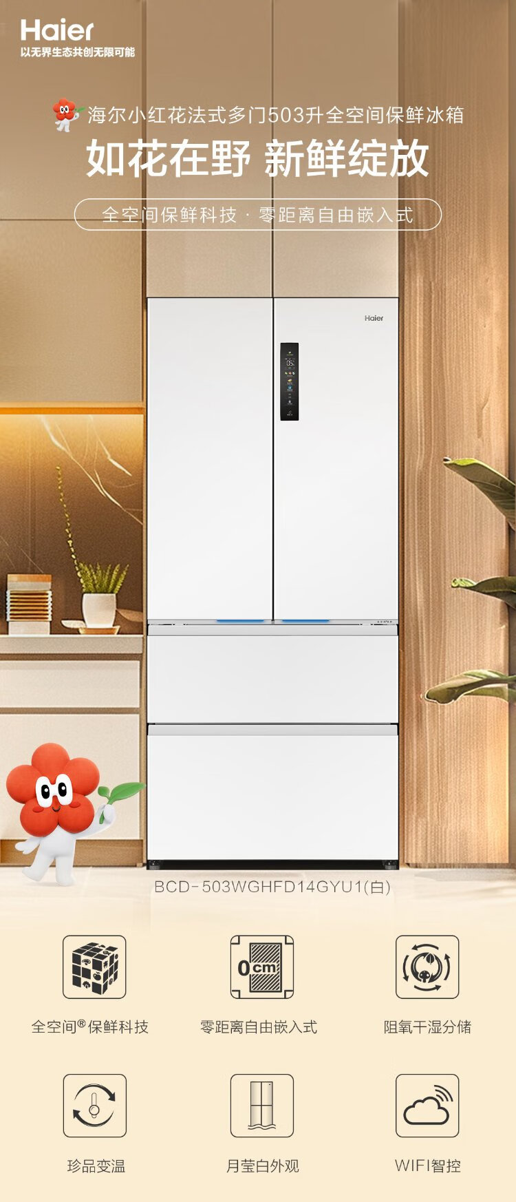 Haier Xiaohonghua series 503L French-style multi-door refrigerator full-space fresh-keeping zero-embedded first-level energy efficiency air-cooled BCD-503WGHFD14GYU1 (white) national subsidy