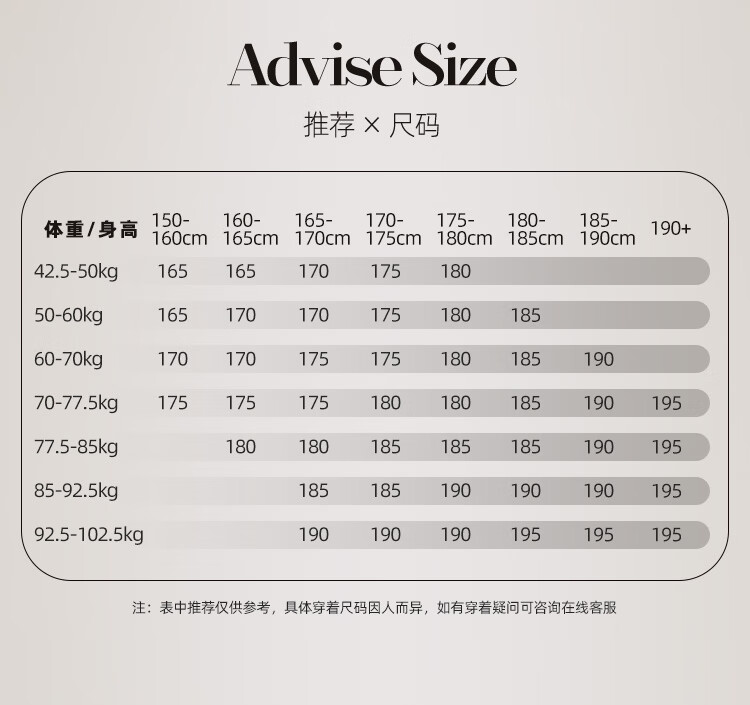 China (cm) 160-165/84-86 165-170 / 88-90 167-172 / 92-96 168-173 / 98-102 170-176 / 106-110