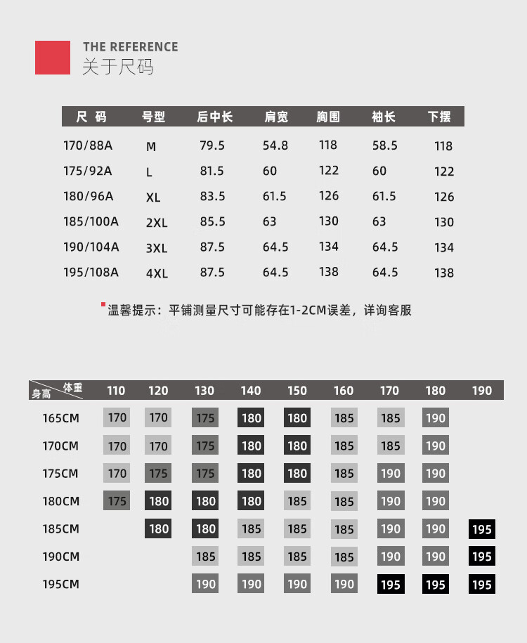 China (cm) 165 / 88-90 170 / 96-98 175 / 108-110 180 / 118-122 185 / 126-130