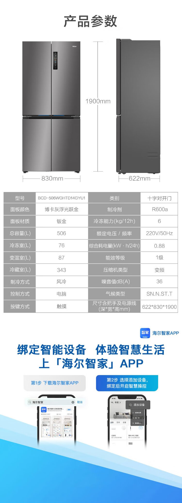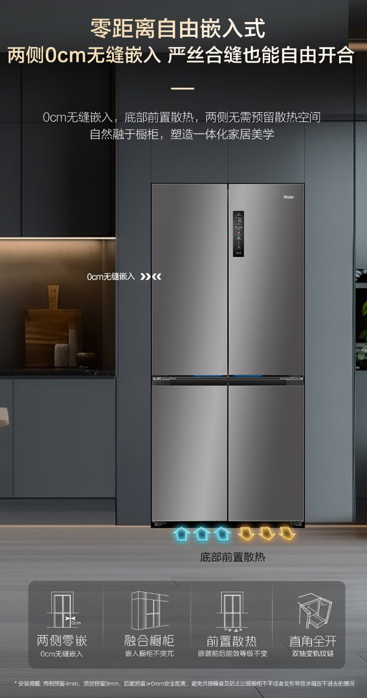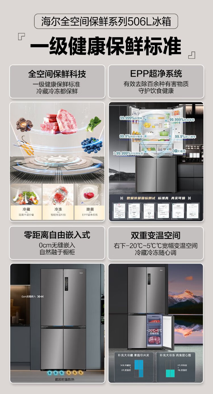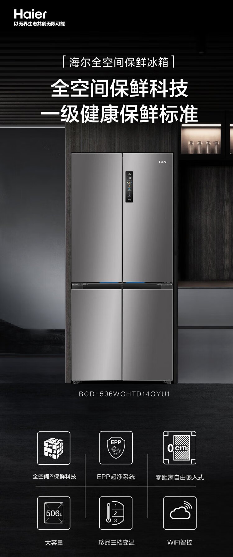 Haier Family Banquet 506-liter full-space fresh-keeping zero-distance free embedded cross-door four-door refrigerator household first-class energy efficiency BCD-506WGHTD14GYU1 20% national subsidy