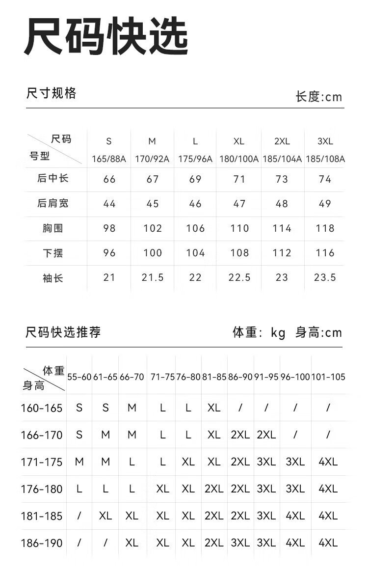 China (cm) 160-165/84-86 165-170 / 88-90 167-172 / 92-96 168-173 / 98-102 170-176 / 106-110